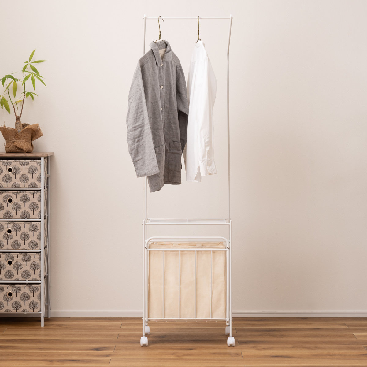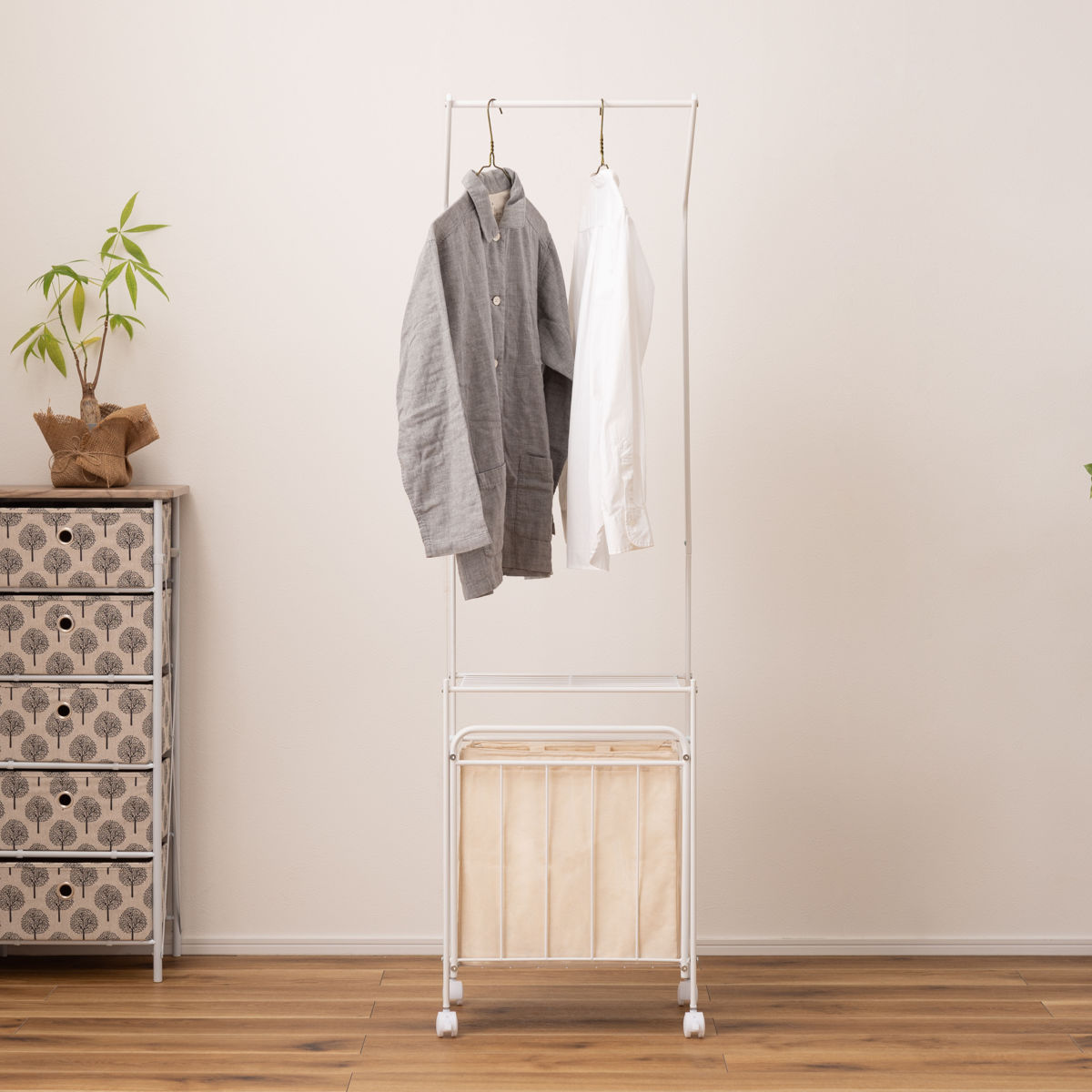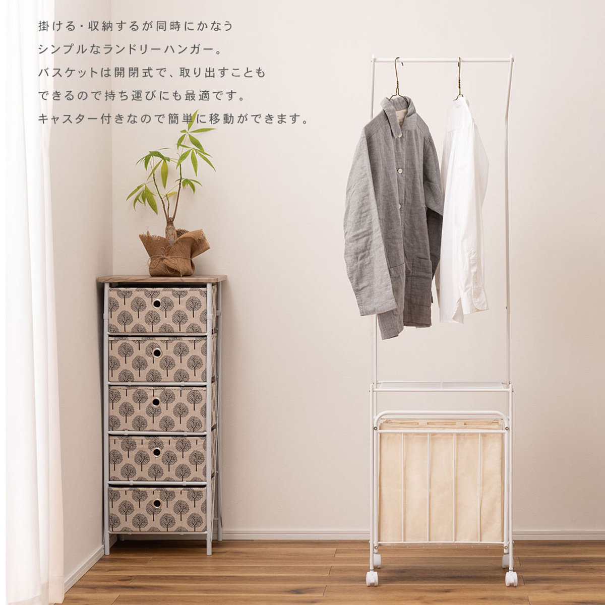 お部屋に馴染むシンプルでスタイリッシュなデザインです。寝室やリビングなどでは、衣類やバッグなどの収納にもお使いいただけ、幅広いシーンで活躍します。