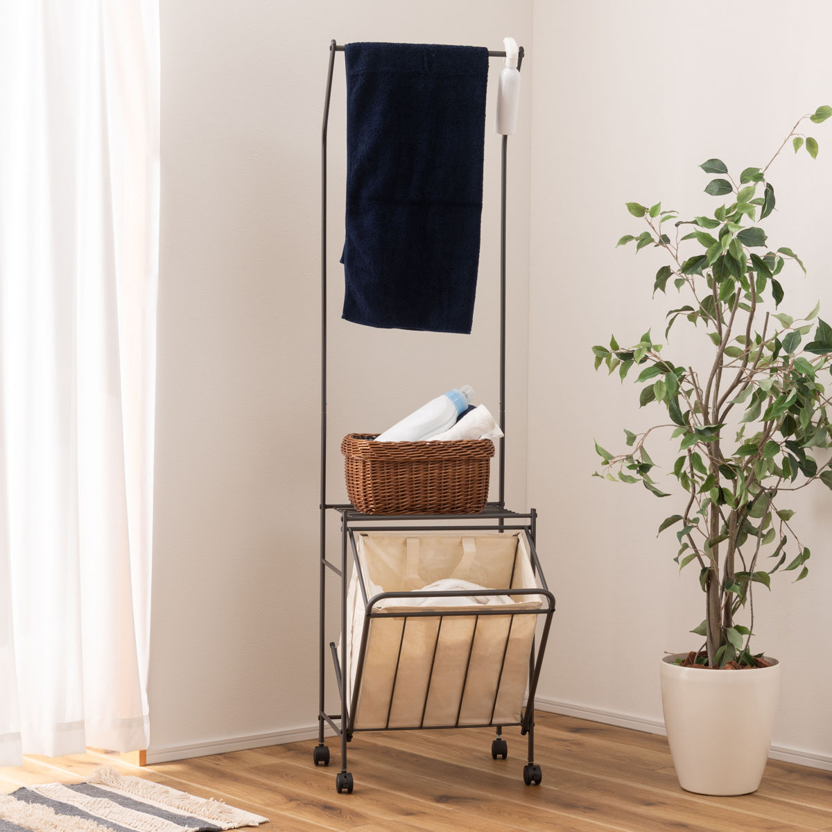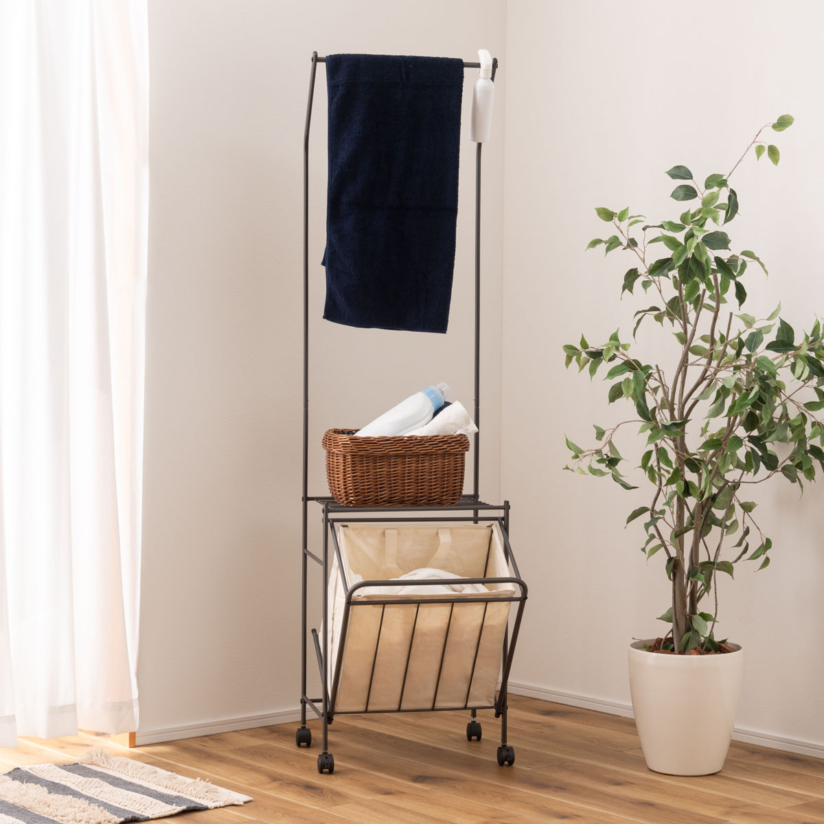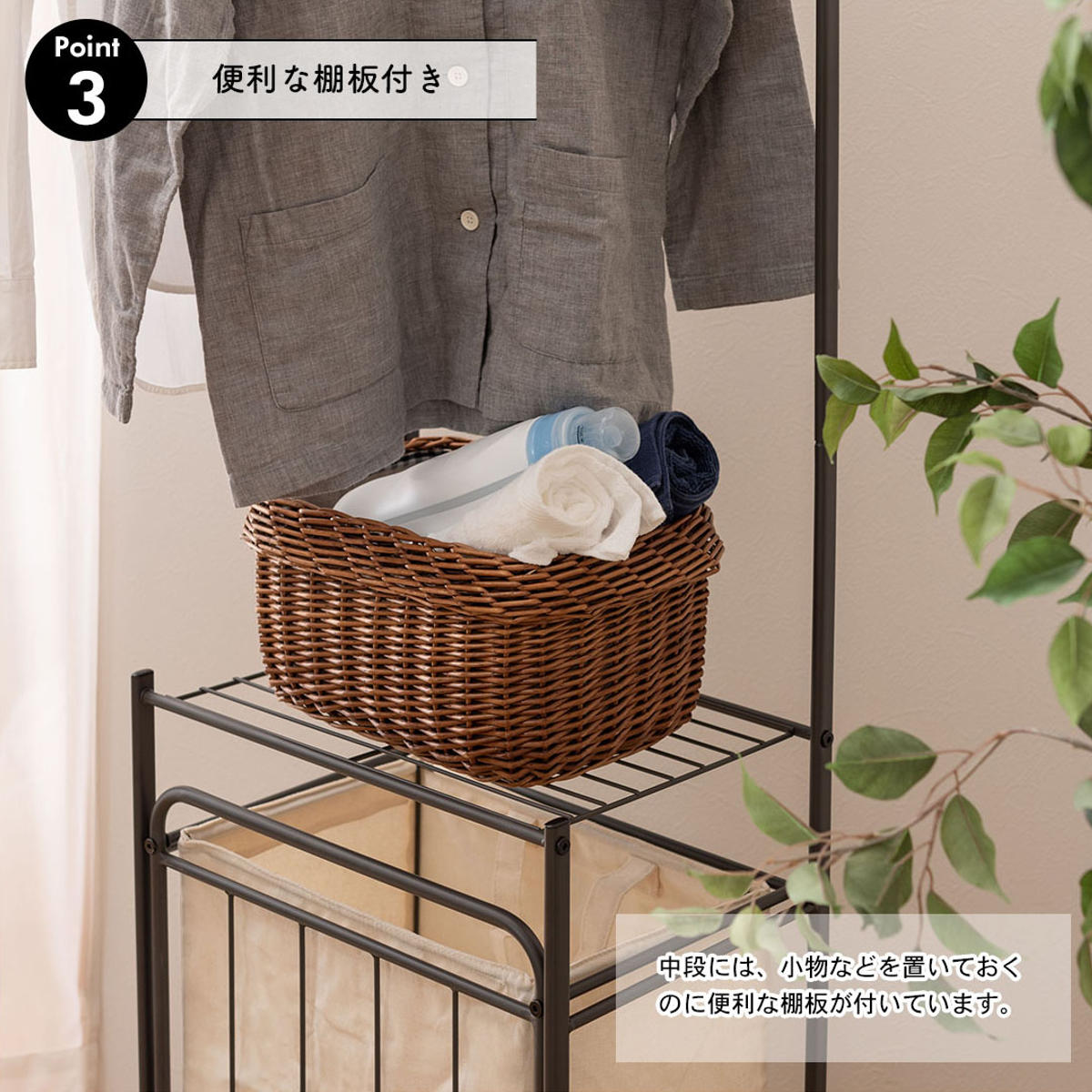 収納スペース付きのランドリーハンガーです。タオルを干せるだけでなく、洗剤などをひとまとめに収納できるので便利です。高さは約163cmでシャツやタオル等をかけても余裕があります。スリム設計なので、一人暮らしの方や、ワンルームにお住まいの方にもおすすめです。
