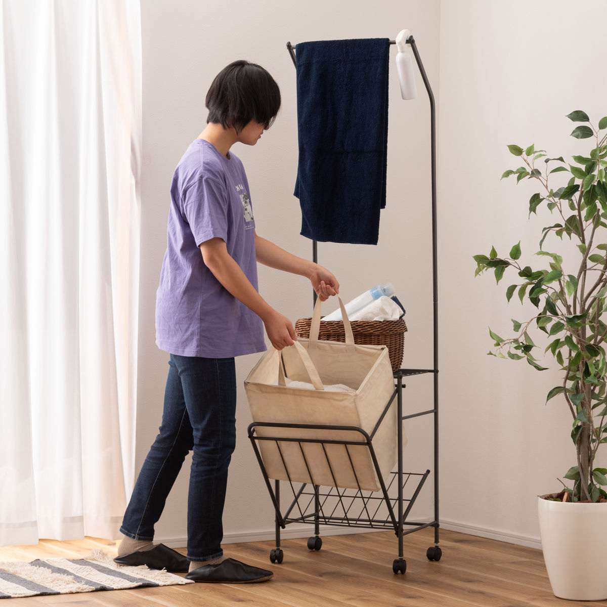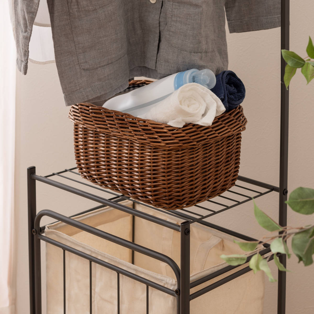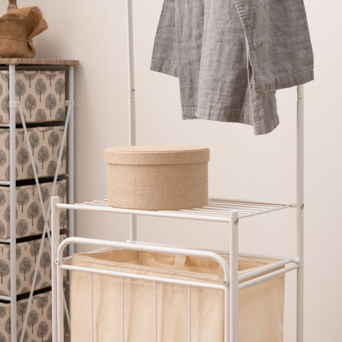 収納スペース付きのランドリーハンガーです。タオルを干せるだけでなく、洗剤などをひとまとめに収納できるので便利です。高さは約163cmでシャツやタオル等をかけても余裕があります。スリム設計なので、一人暮らしの方や、ワンルームにお住まいの方にもおすすめです。