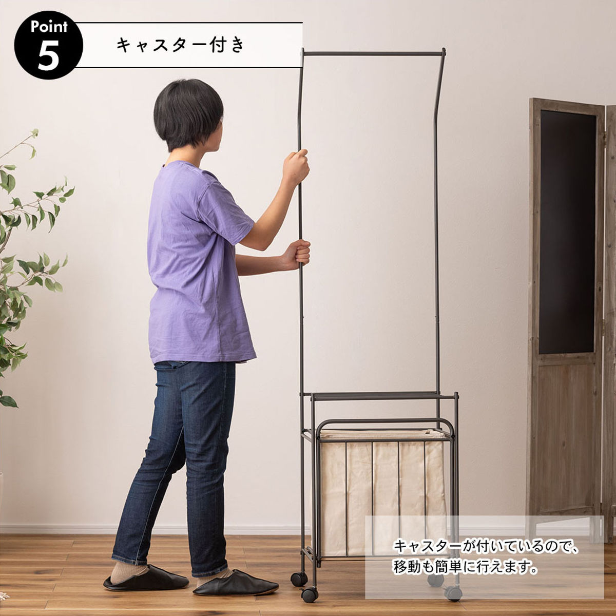 キャスター付きで移動が楽にできるので、掃除や模様替えもスムーズに行えます。4個のキャスターのうち2個は、ストッパーで固定できるので安心です。