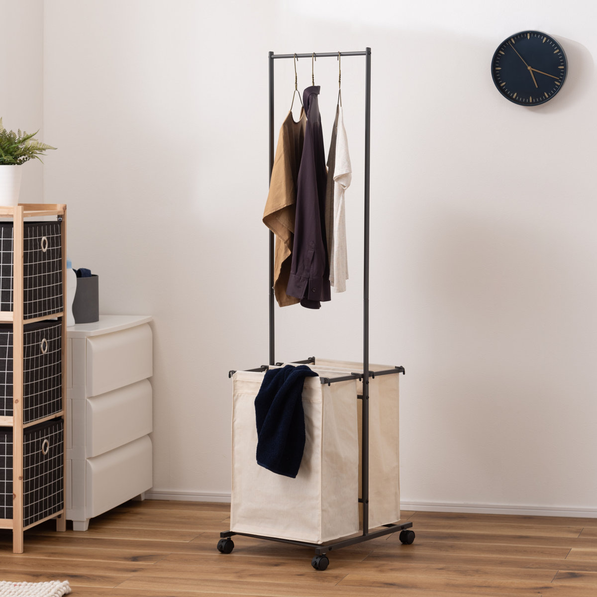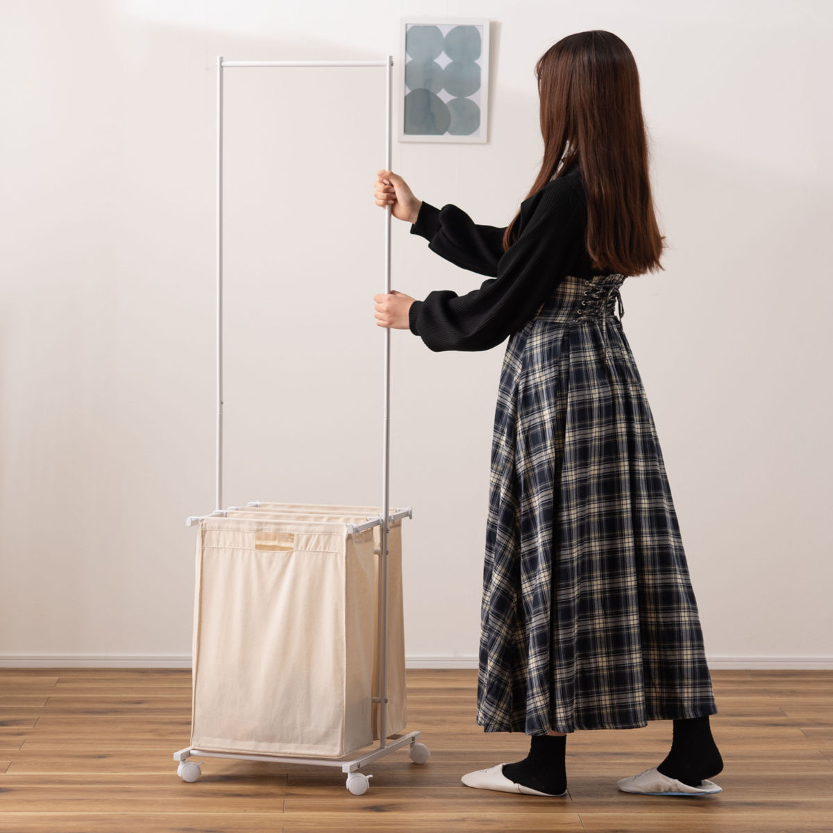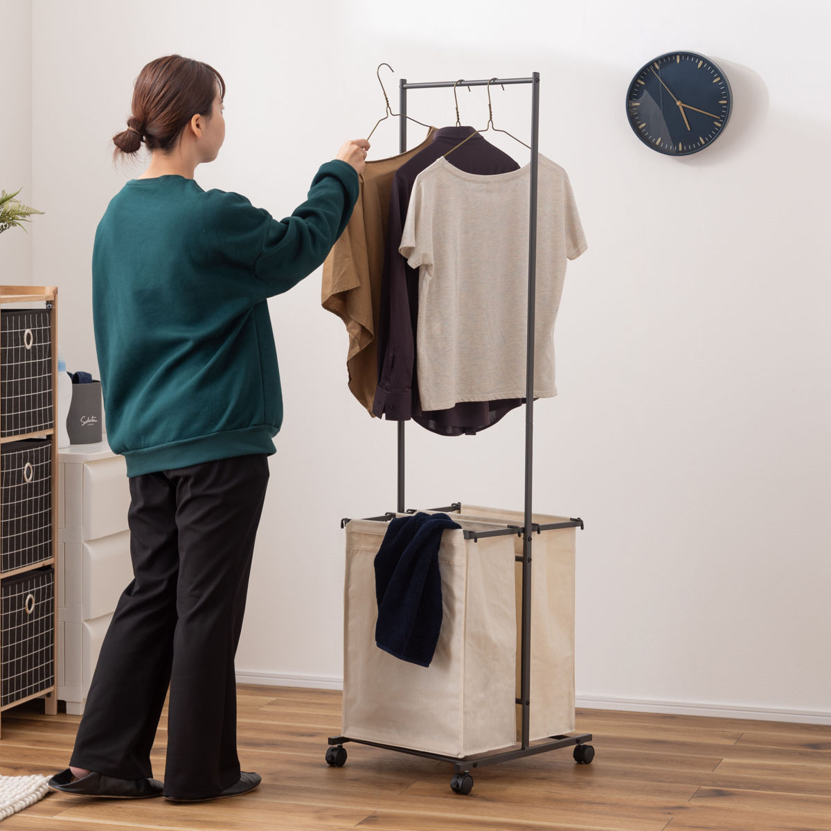 収納スペース付きのランドリーハンガーです。タオルを干せるだけでなく、洗剤などをひとまとめに収納できるので便利です。高さは約157.3cmでシャツやタオル等をかけても余裕があります。スリム設計なので、一人暮らしの方や、ワンルームにお住まいの方にもおすすめです。