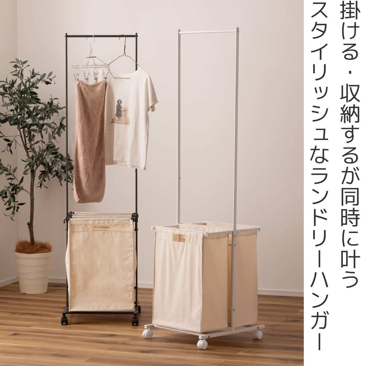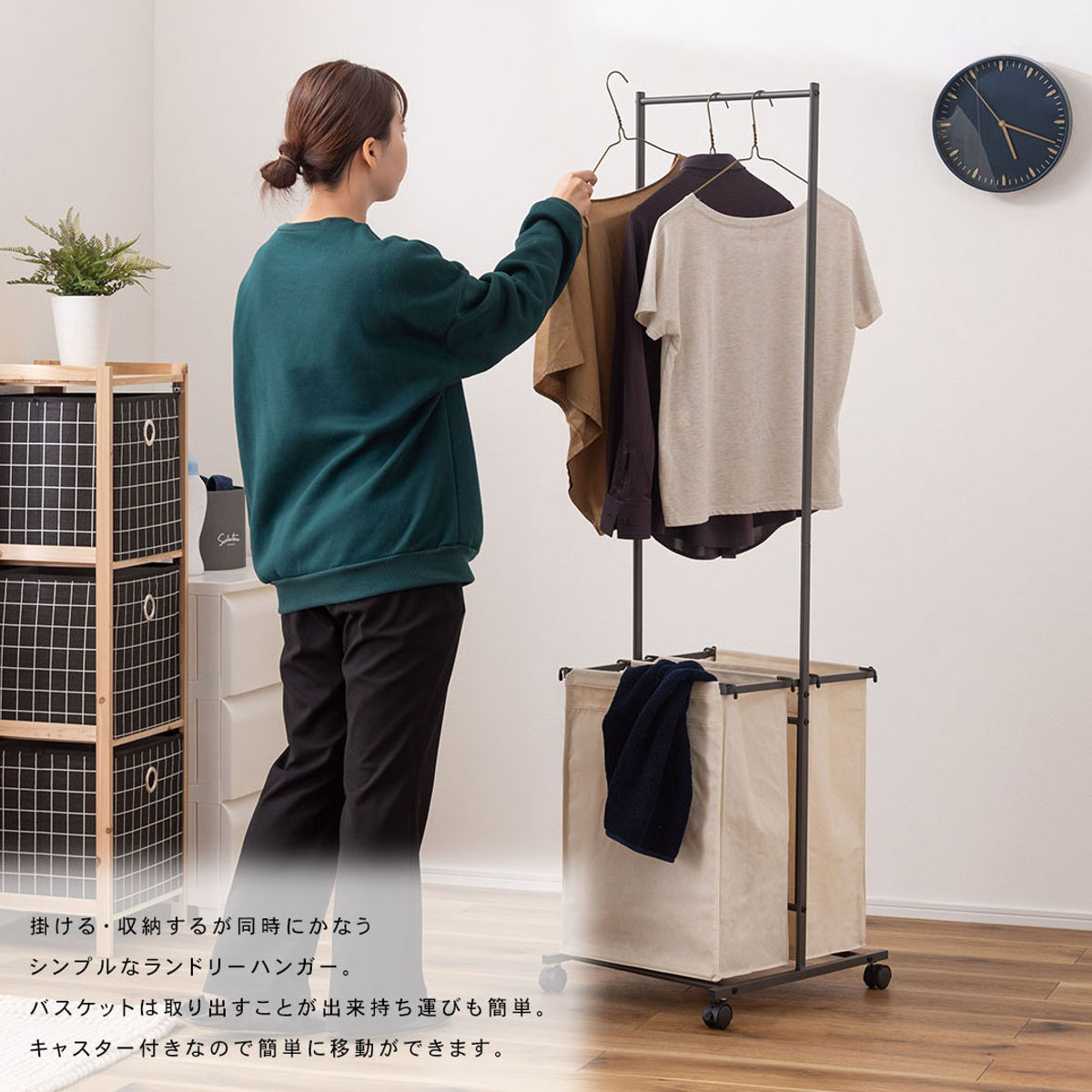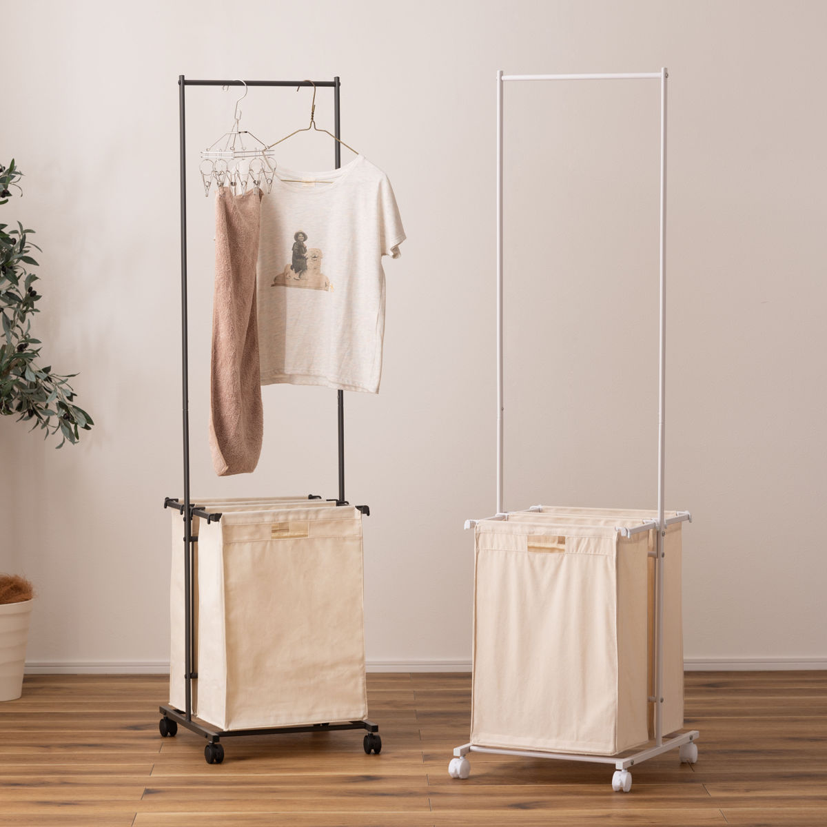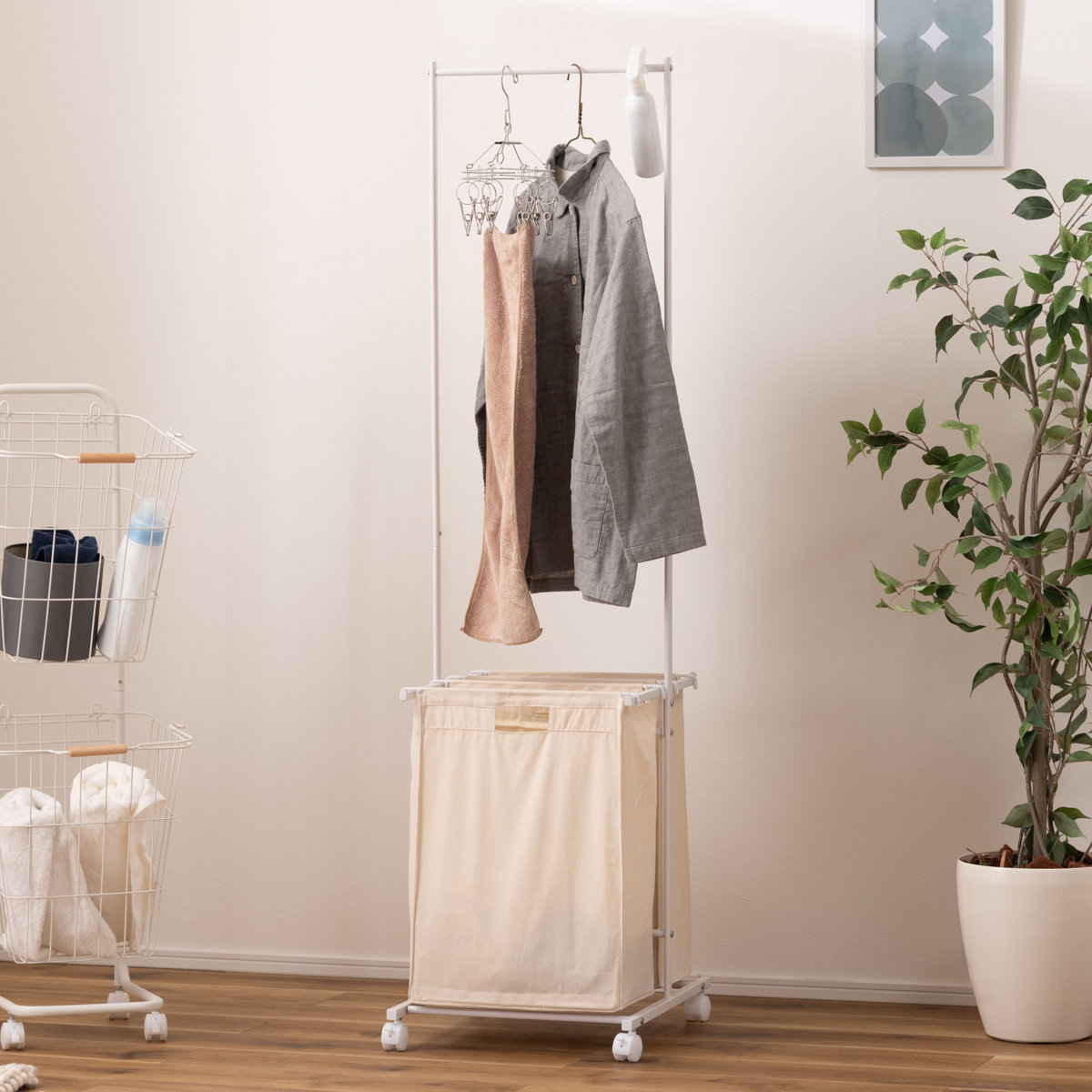 洗濯物干し スリム キャスター付 室内物干し ハンガーワゴン ( ランドリーワゴン ハンガーラック ワゴン ラック バスケット付き 物干し 衣類収納 シンプル 室内干し 室内 洗濯 収納 コート掛け 棚板付き おしゃれ ) 【ホワイト】