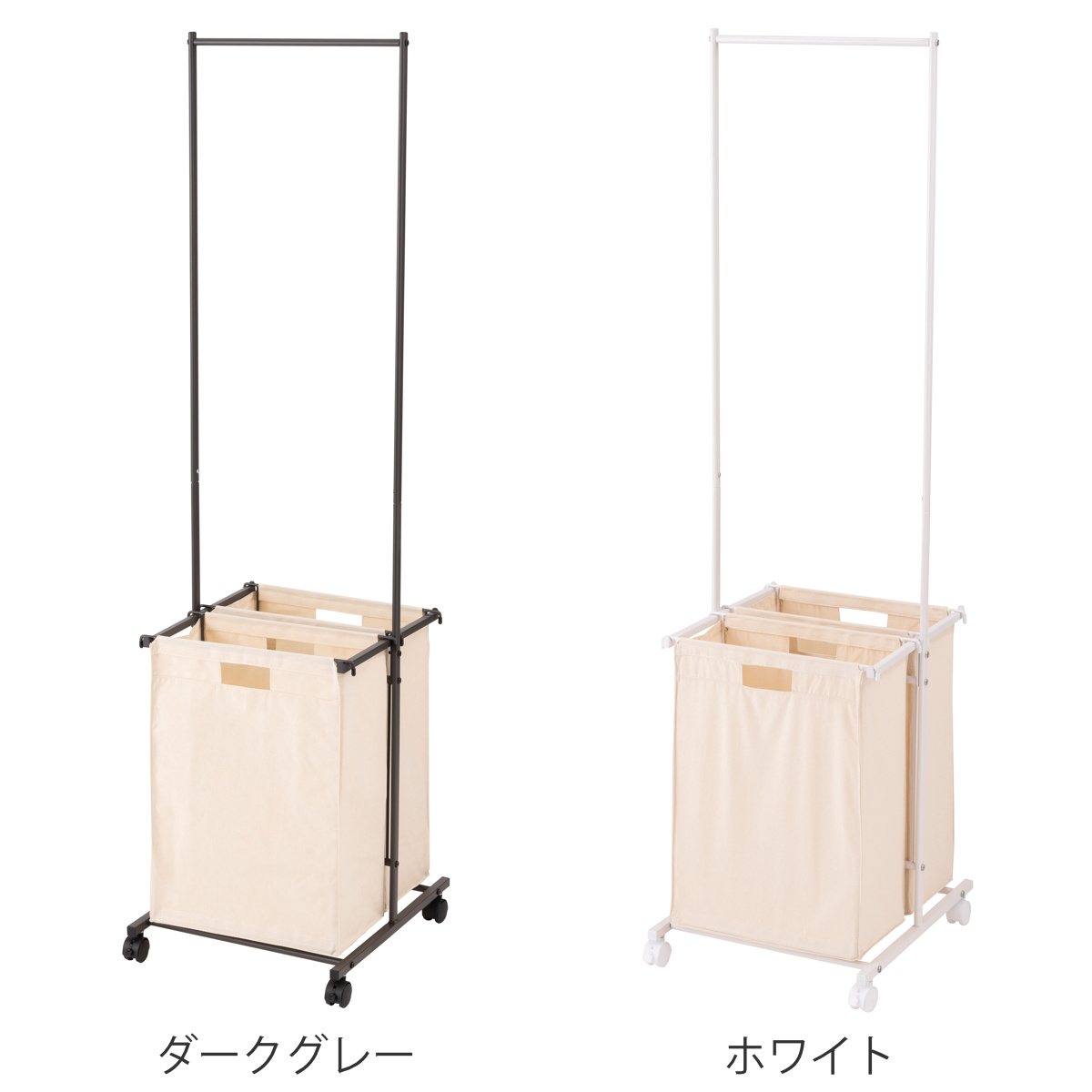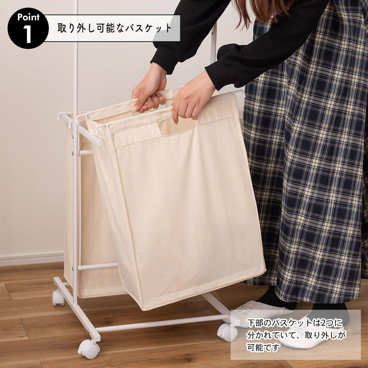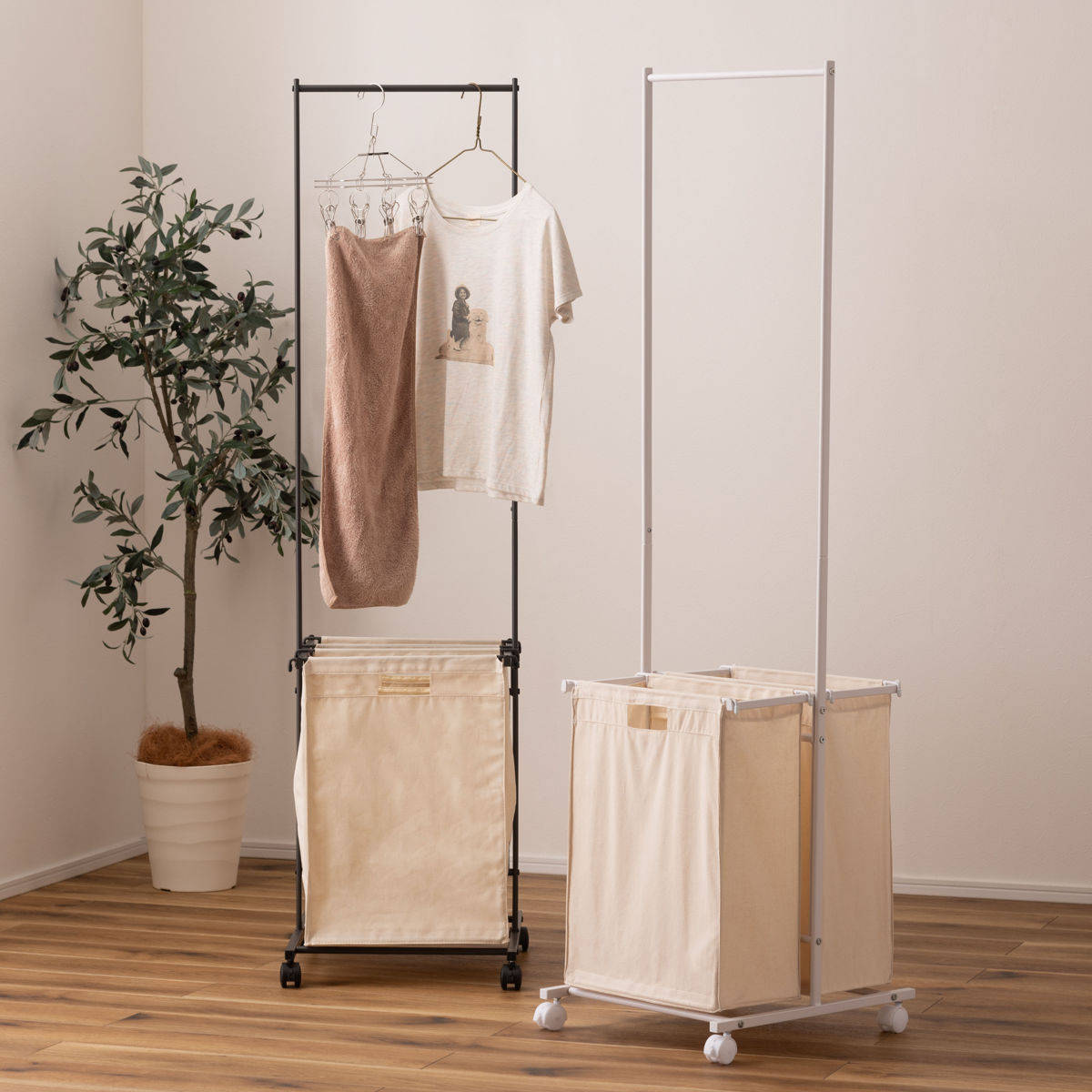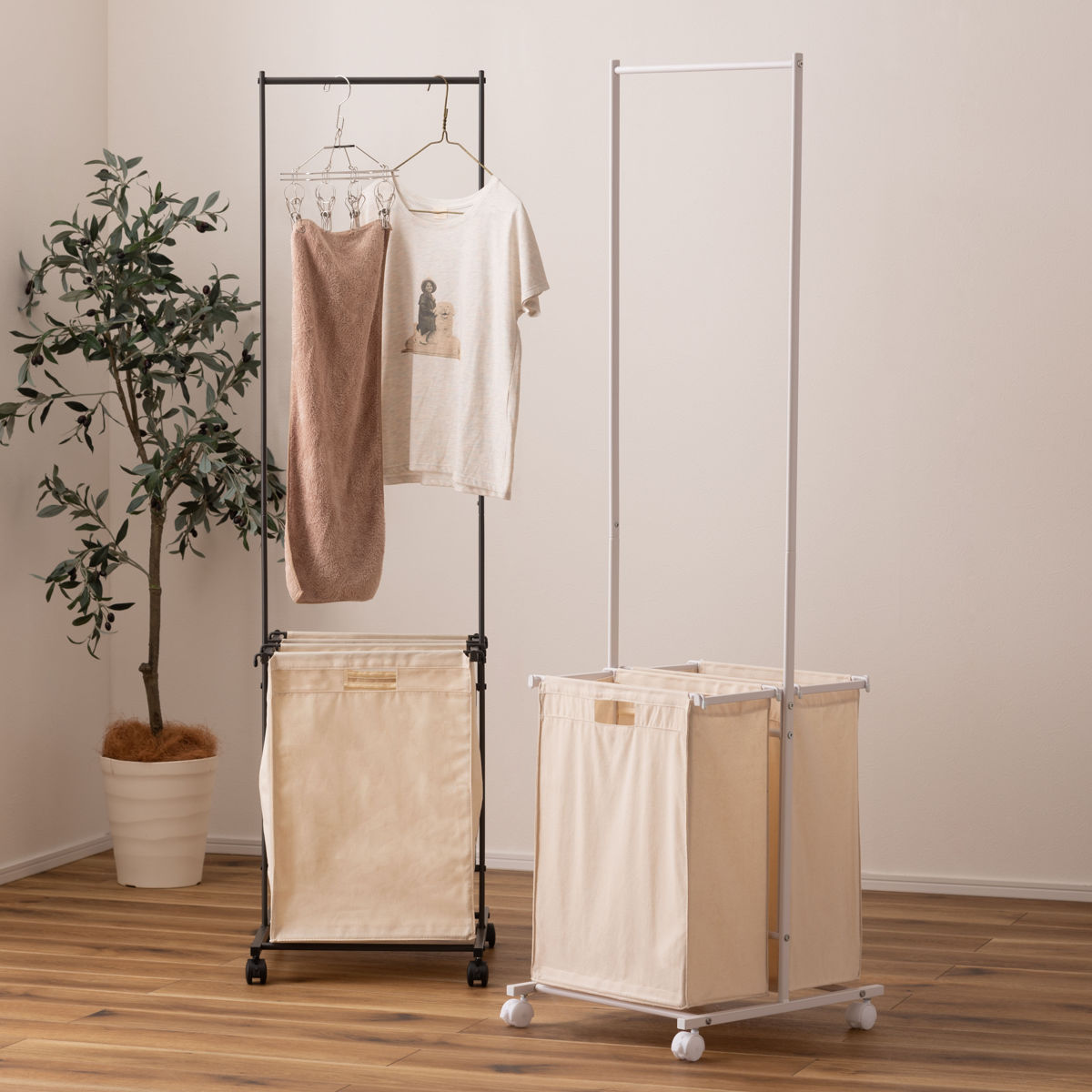 洗濯物干し スリム キャスター付 室内物干し ハンガーワゴン ( ランドリーワゴン ハンガーラック ワゴン ラック バスケット付き 物干し 衣類収納 シンプル 室内干し 室内 洗濯 収納 コート掛け 棚板付き おしゃれ ) 【ホワイト】