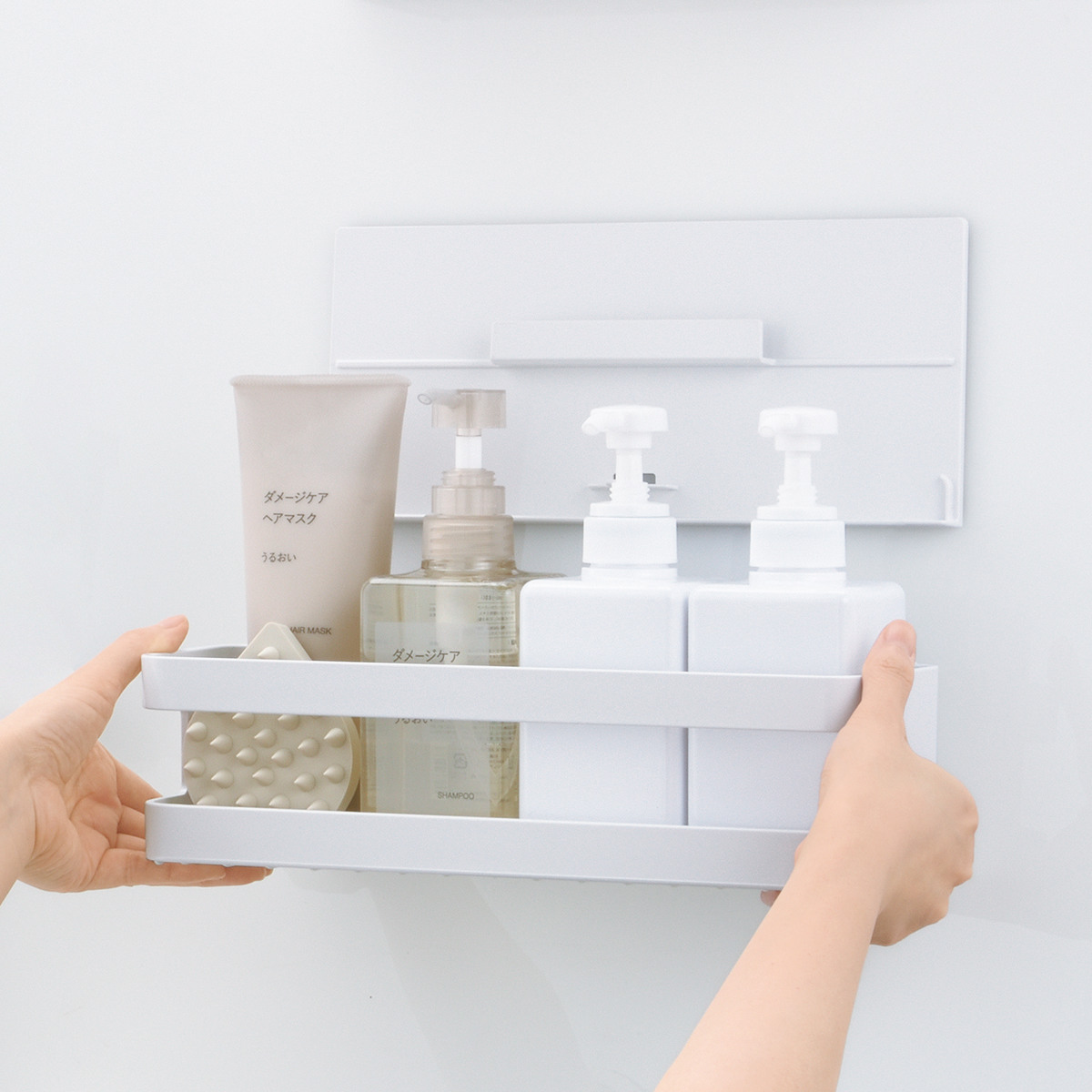 取り付け板は壁にそのまま残した状態で、トレーだけをサッと取り外して移動できます。使う場所に合わせて柔軟に使い分けでき、日々のバスタイムをより快適にサポートします。