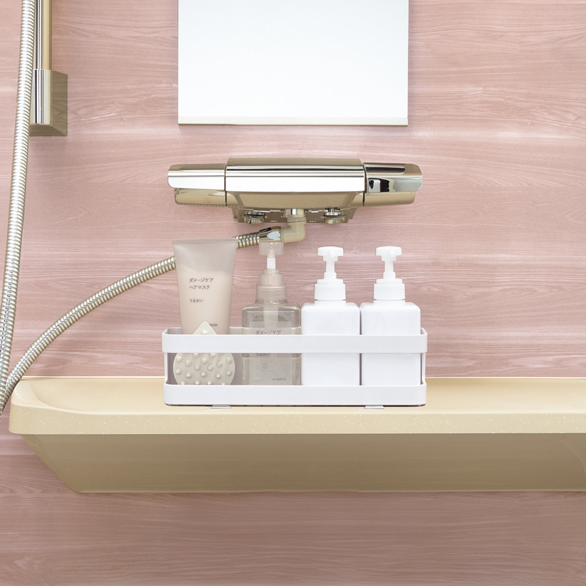 シャワーの飛び散りを避けて壁面に浮かせて収納できるトレーです。トレーが濡れにくく、使用後も乾きやすい状態が続きます。湿気がこもりにくい構造で、カビやヌメリの発生を抑えながら、バスルームを清潔に保ちたい方にぴったりの設計です。