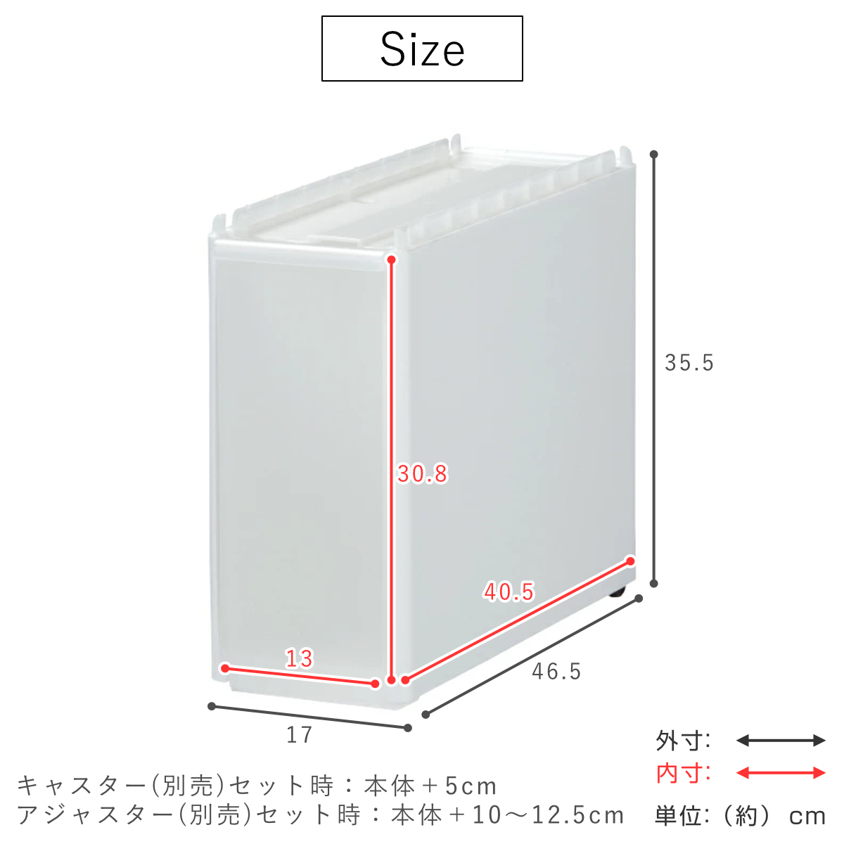 | サイズ | 外寸:約 幅17×奥行46.5×高さ35.5(cm) 内寸:約 幅13×奥行40.5×高さ30.8(cm) |