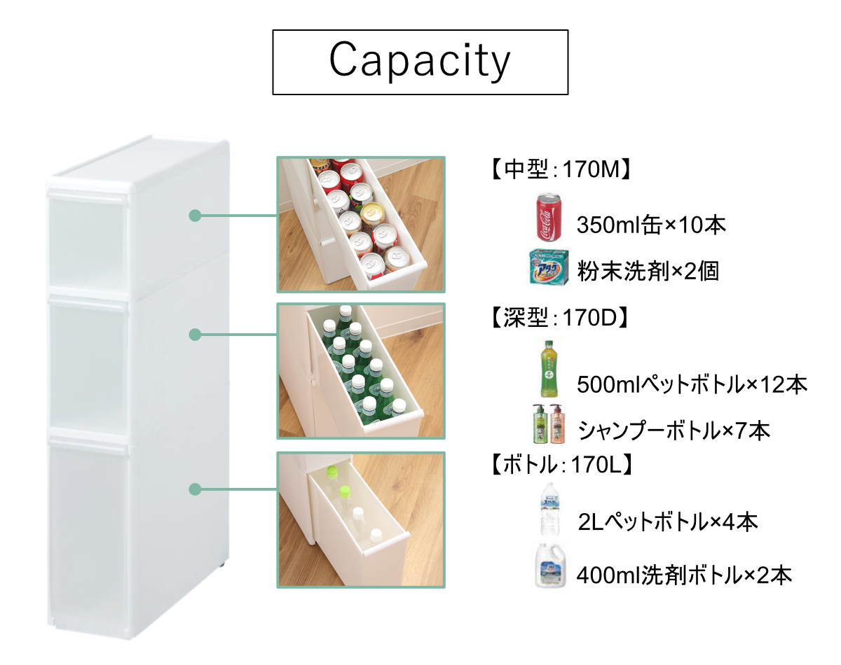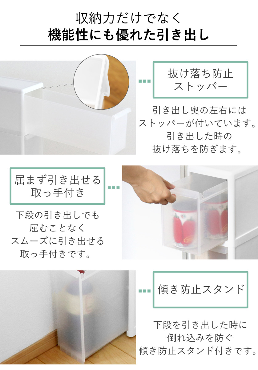 | 引き出し1段あたり耐荷重 | 中型・深型:約 5kg ボトル:約 10kg |