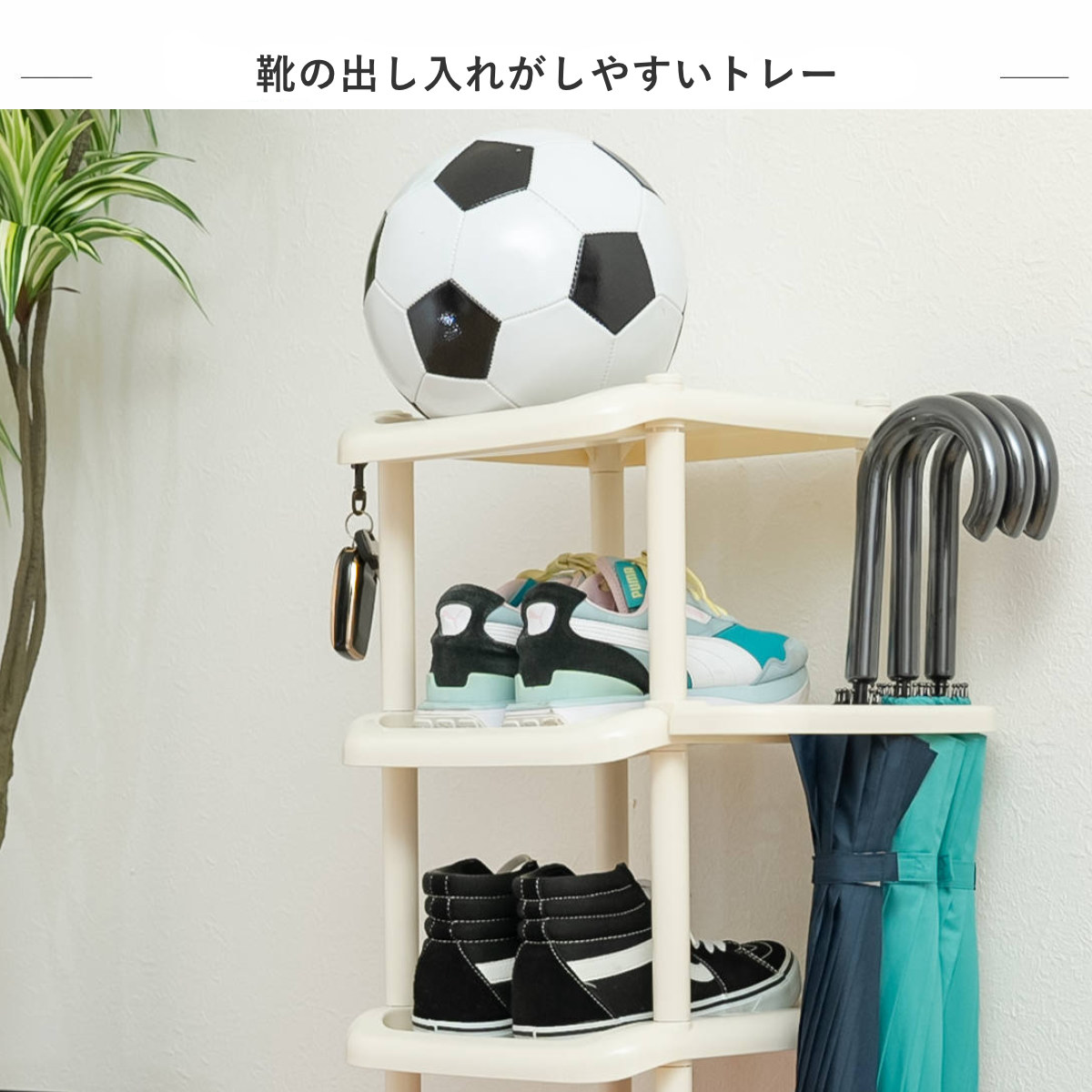 軽くて、汚れても掃除がしやすいプラスチック製です。少し傾斜がついたトレーは靴の出し入れがしやすく、ストッパーの役割にもなっているので、ボールやヘルメットの置き場所にもおすすめです。
