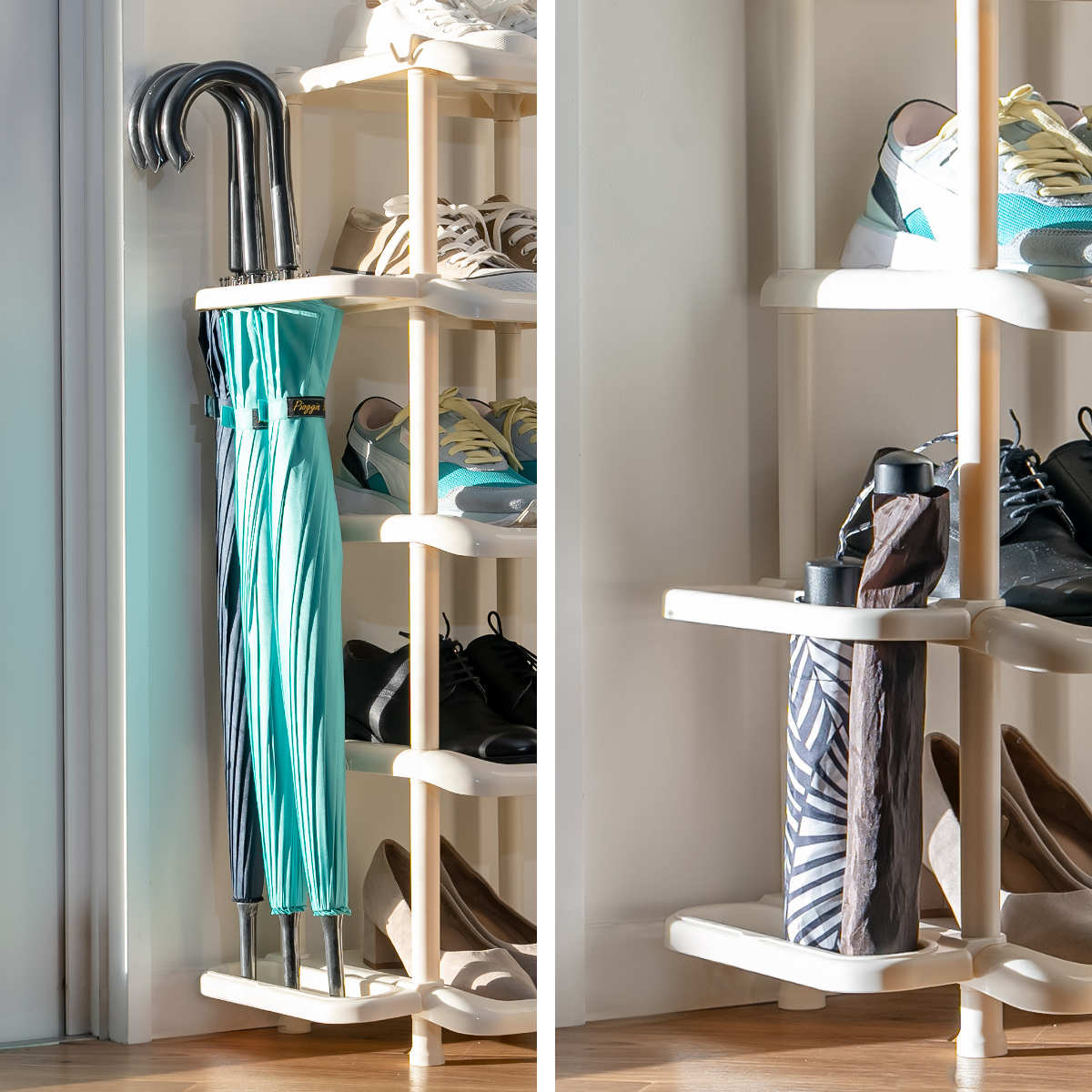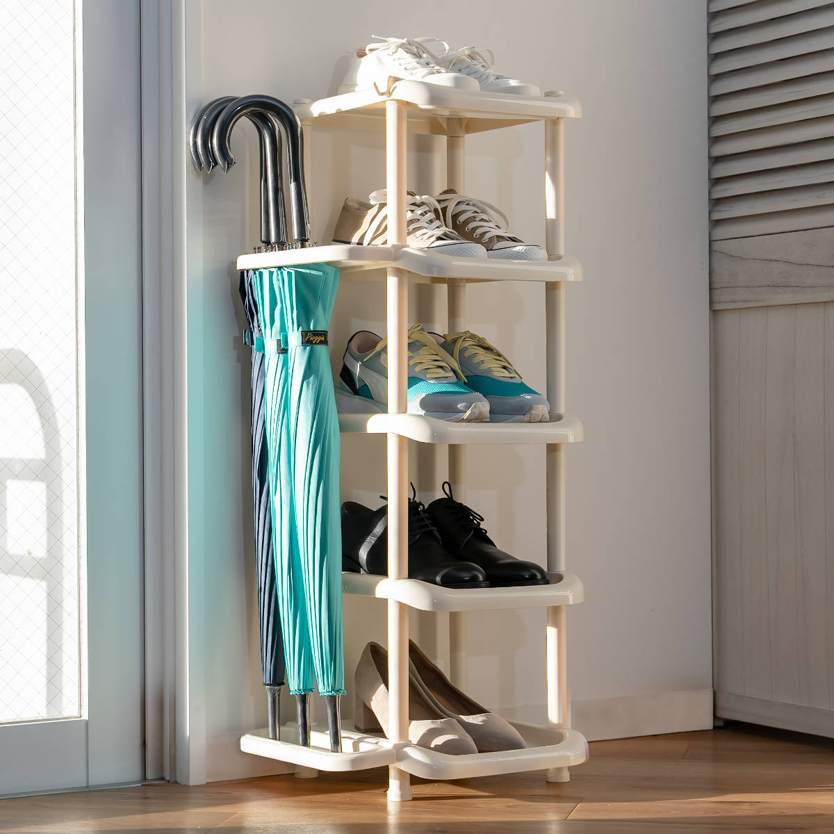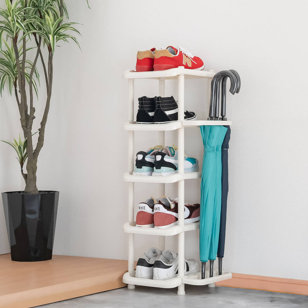 靴と傘をまとめて収納できるシューズラックです。一人暮らしの方や靴を頻繁に出し入れするお子さまのいるご家庭におすすめのスリムタイプです。靴は5足、傘は5本収納できるので、狭くなりがちな玄関スペースもスッキリ片付きます。