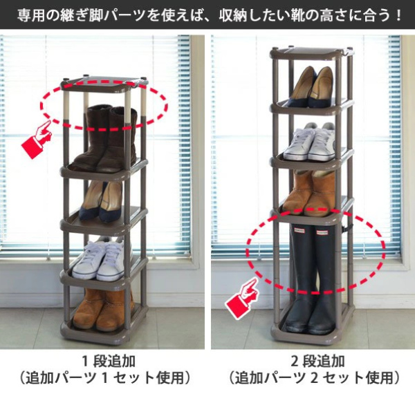 別売りの専用継ぎ脚パーツを使えば、高さを伸ばすことができます。1セット足すと高さが約29cmになるので、ショートブーツやミドルタイプの靴、2セット足すと高さが約41cmになるので、長靴やロングブーツの収納が可能です。