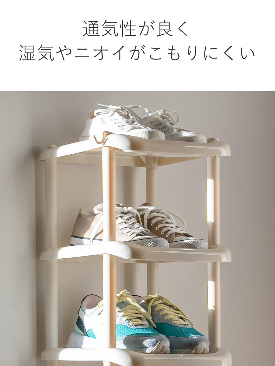 オープンタイプなので、風通しが良く、カビやニオイの原因となる湿気が留まりにくくなっています。蒸れやすい脱ぎたての靴も気にせず収納でき、お気に入りの靴もキレイに保管できます。