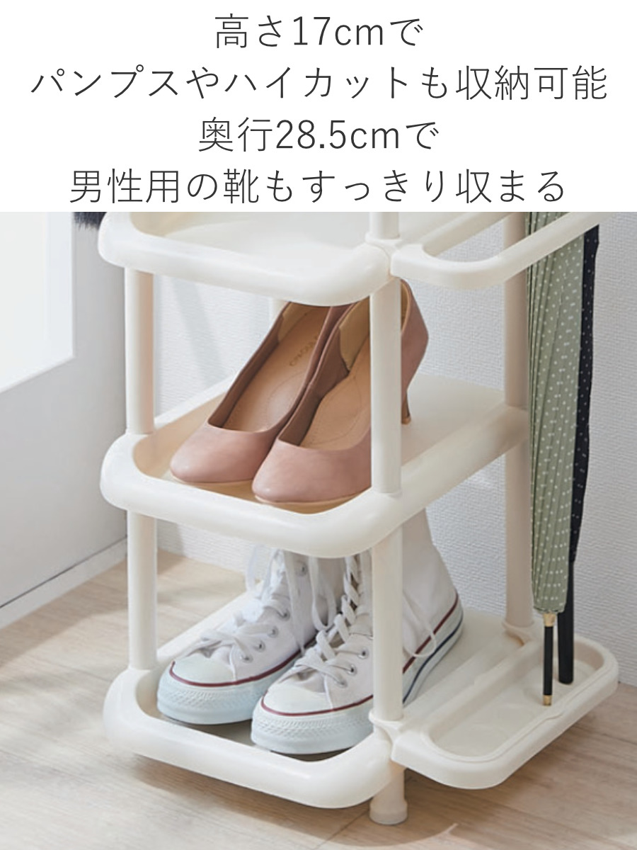 高さは17cmあるので、一般的なシューズはもちろん、パンプスやハイカットシューズも収納できます。また、奥行は28.5cmと男性の靴もしっかり収まります。