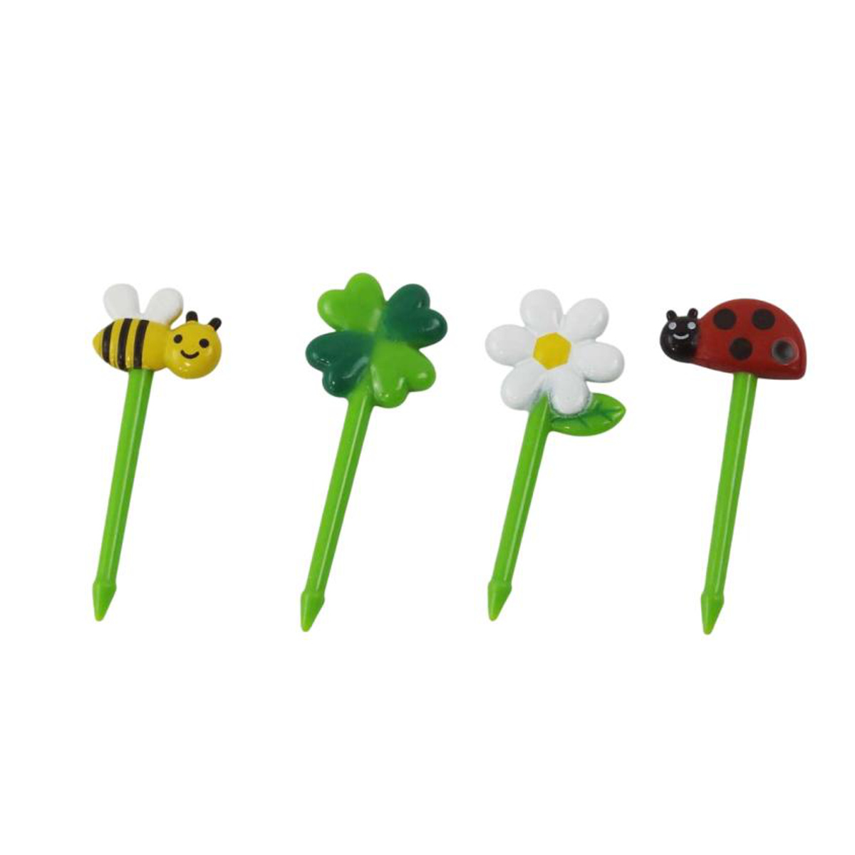 てんとう虫とみつばち、お花とクローバーでお花畑をイメージさせるかわいいピックです。4種類各2本入りです。
