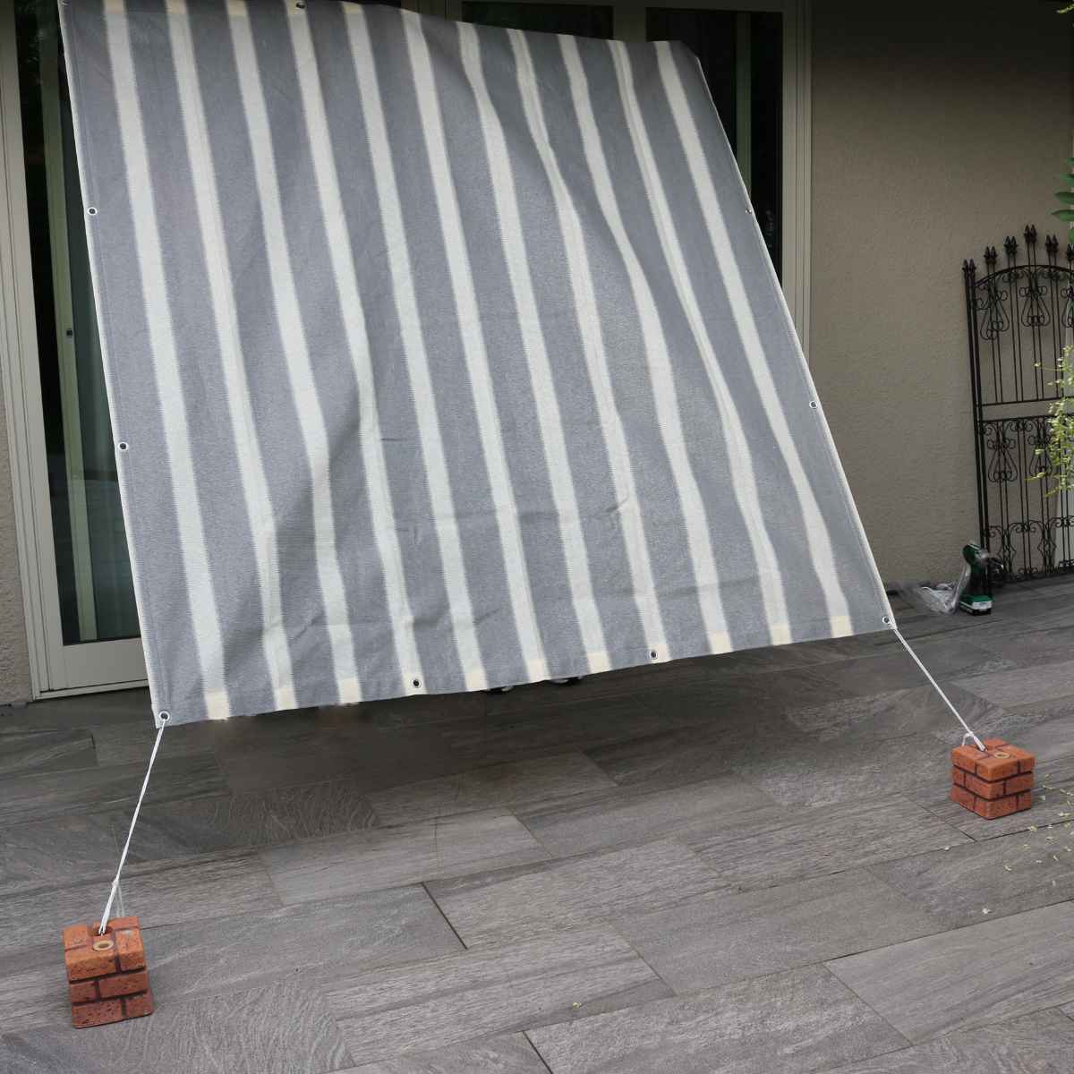 紐を金具に結ぶだけで、オーニングを簡単に固定できます。