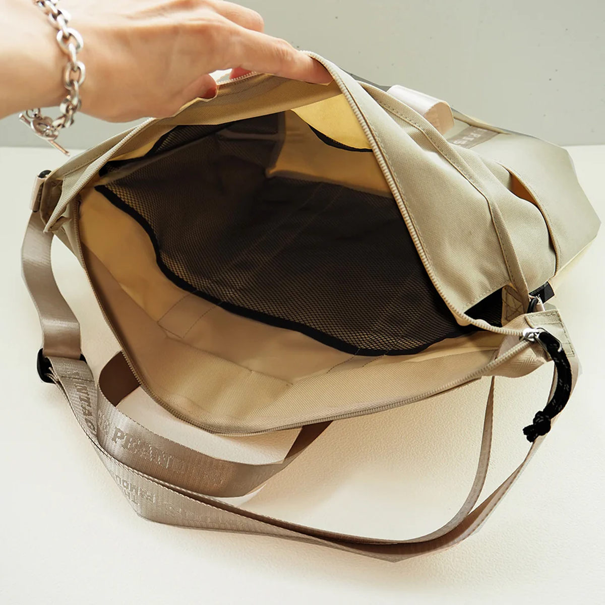 内側にメッシュ素材のポケットがあり、鍵や小物など細かいものの整理に役立ちます。