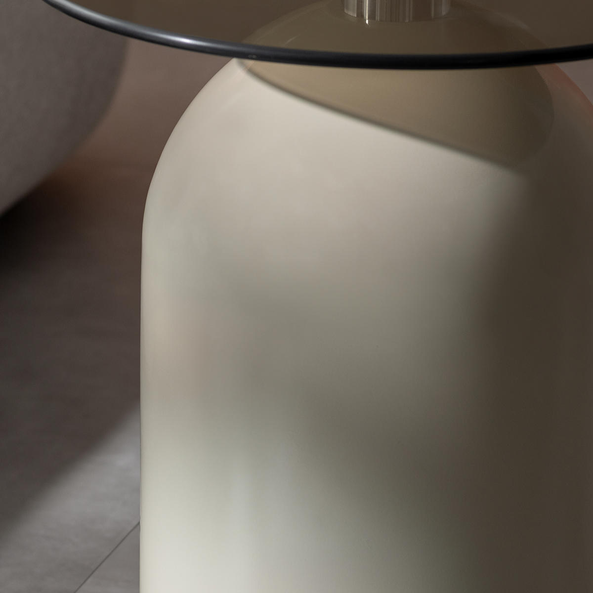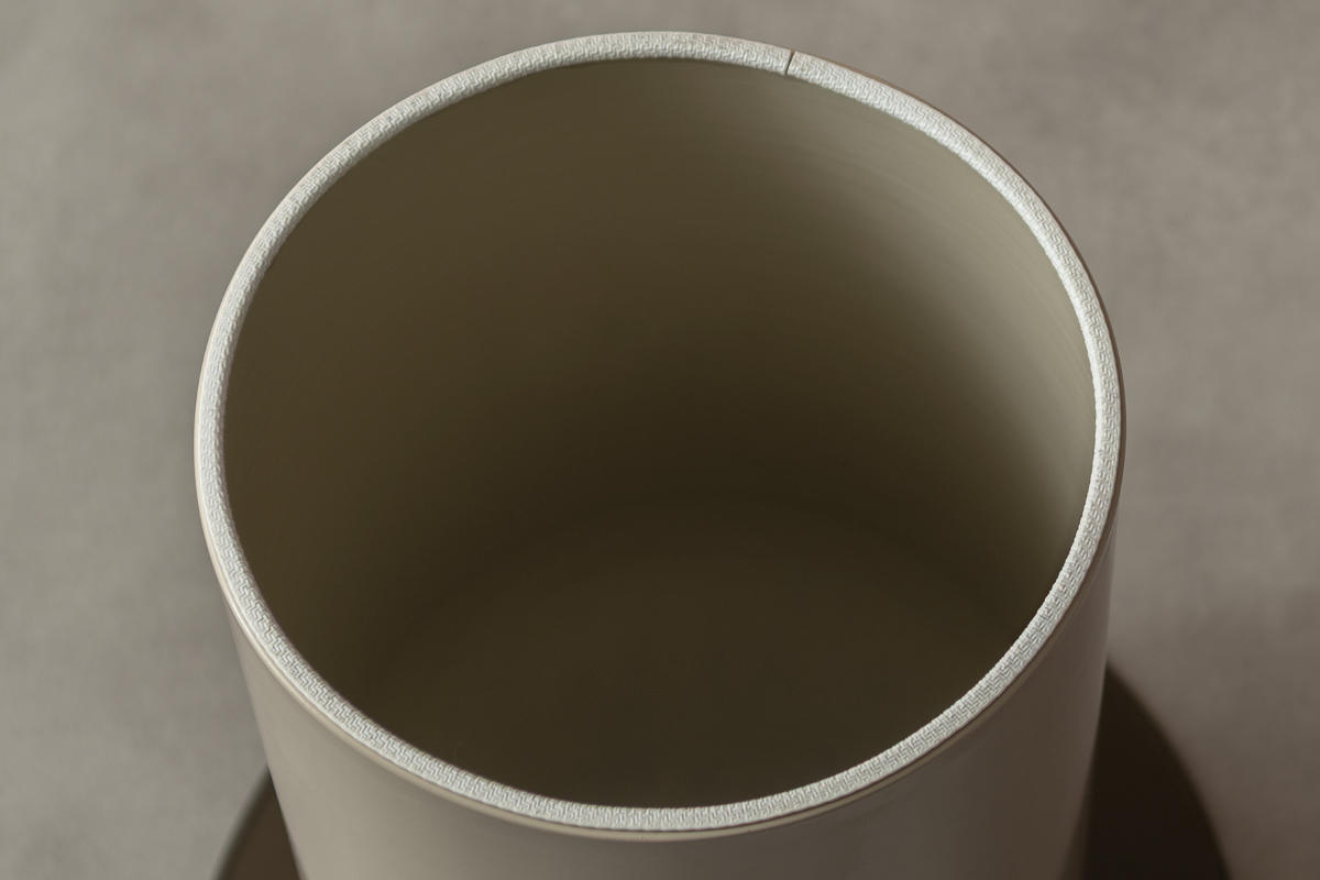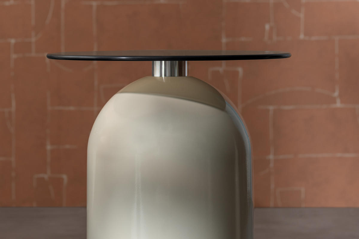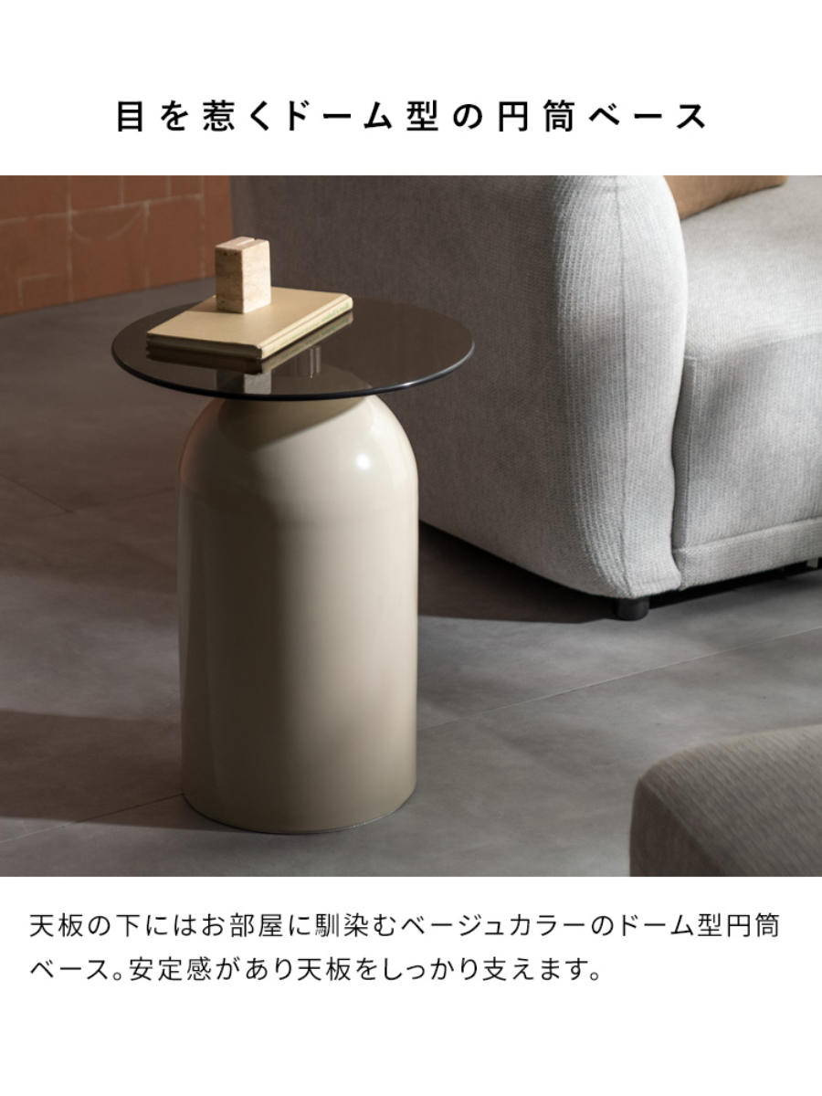 マットな質感のベージュカラーのドーム型円筒ベースは、スチール製で安定感抜群。天板をしっかり支えながら、上品な存在感を放ちます。