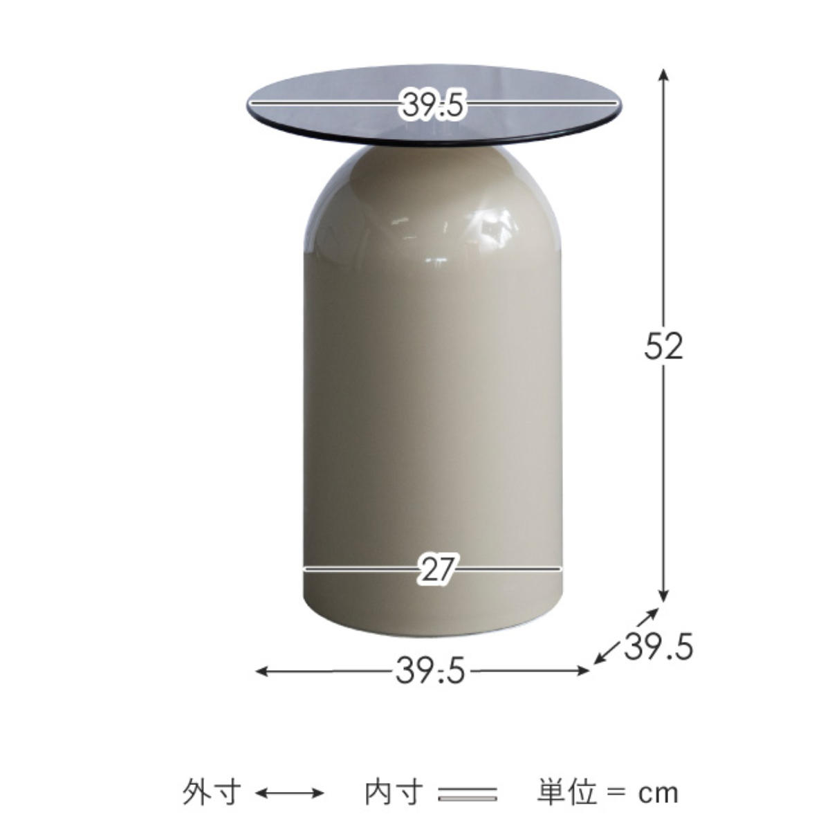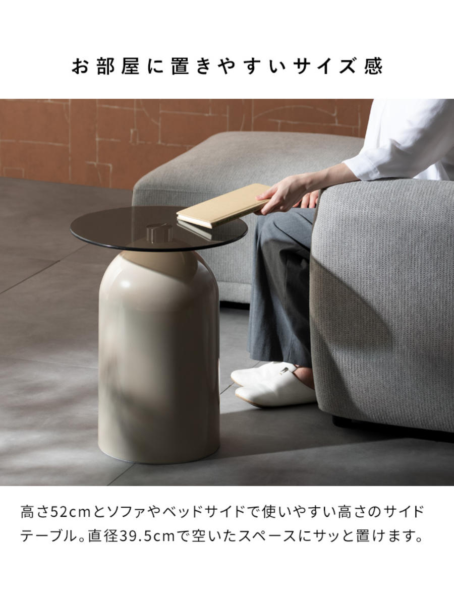 高さ52cmでソファ横やベッドサイドにぴったり。直径39.5cmの天板は、飲み物や小物を置くのにちょうどいいサイズ感です。