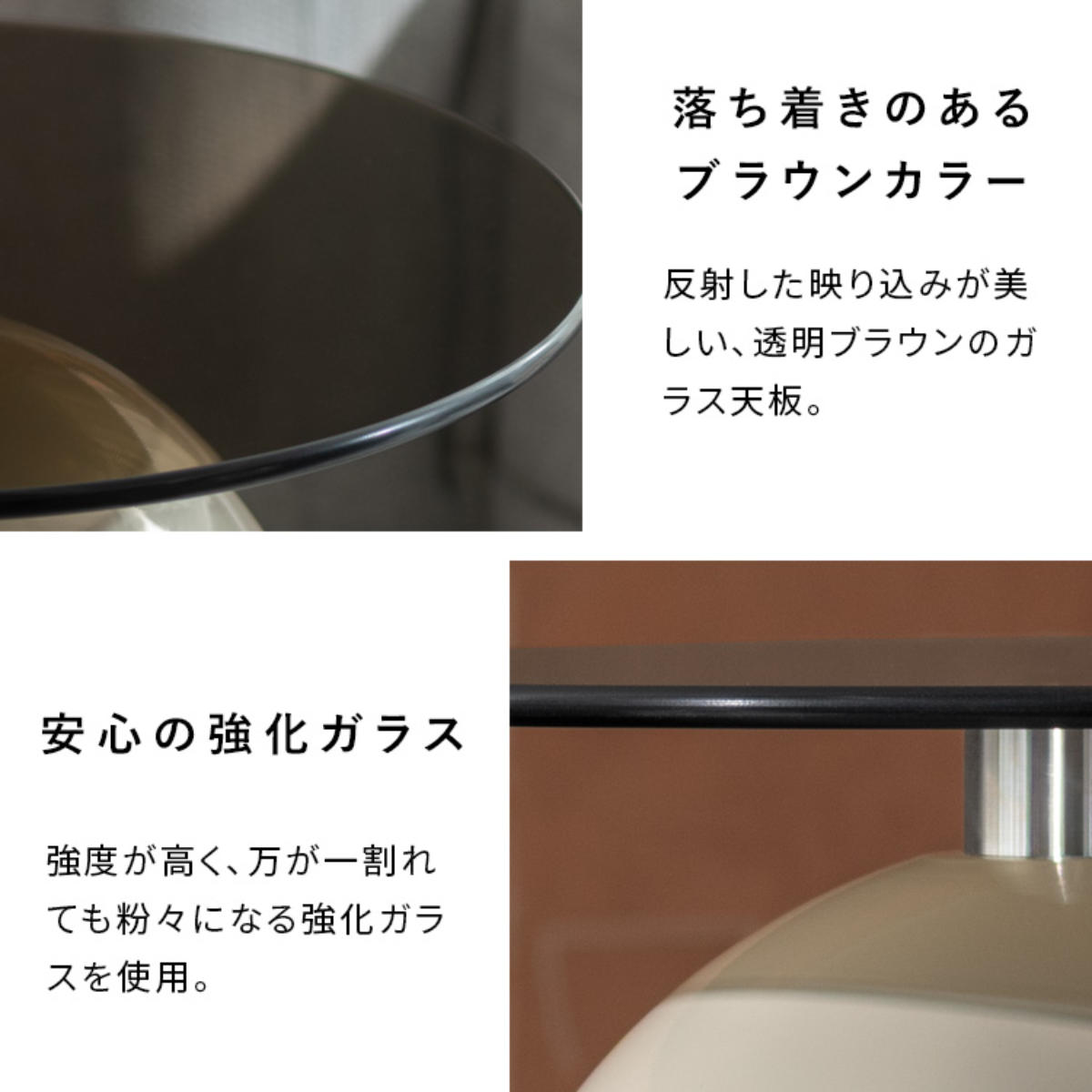 天板は透け感のあるブラウンガラスを採用。美しい光の映り込みが空間に奥行きを与えます。強化ガラス製で割れにくい安全設計です。