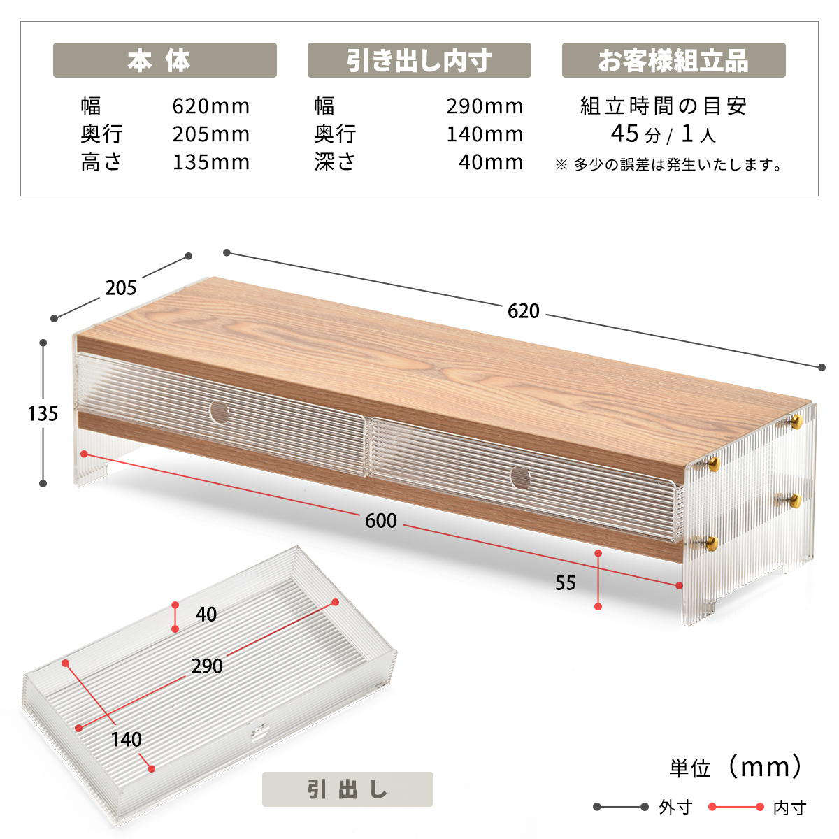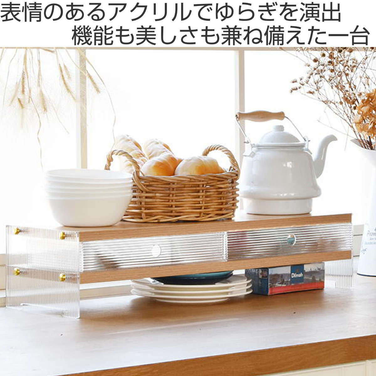 キッチンラック アクリル 収納棚 ワイドタイプ ( キッチン収納 ディッシュラック 収納ラック カウンター上 シェルフ 引出し 木目調 卓上 モニター台 デスク収納 ディスプレイ リブ 透け感 耐久性 丈夫 おしゃれ )