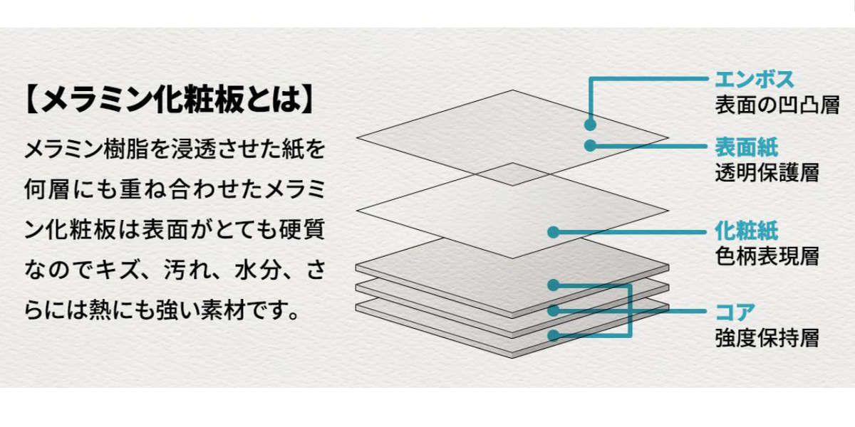 メラミン化粧板は表面が硬く、キズや汚れ、水分、熱にも強い素材です。水や汚れがついてもサッと拭き取るだけで、お手入れも簡単です。