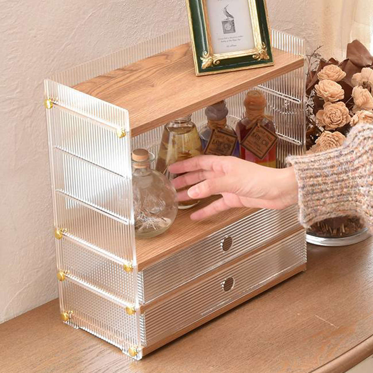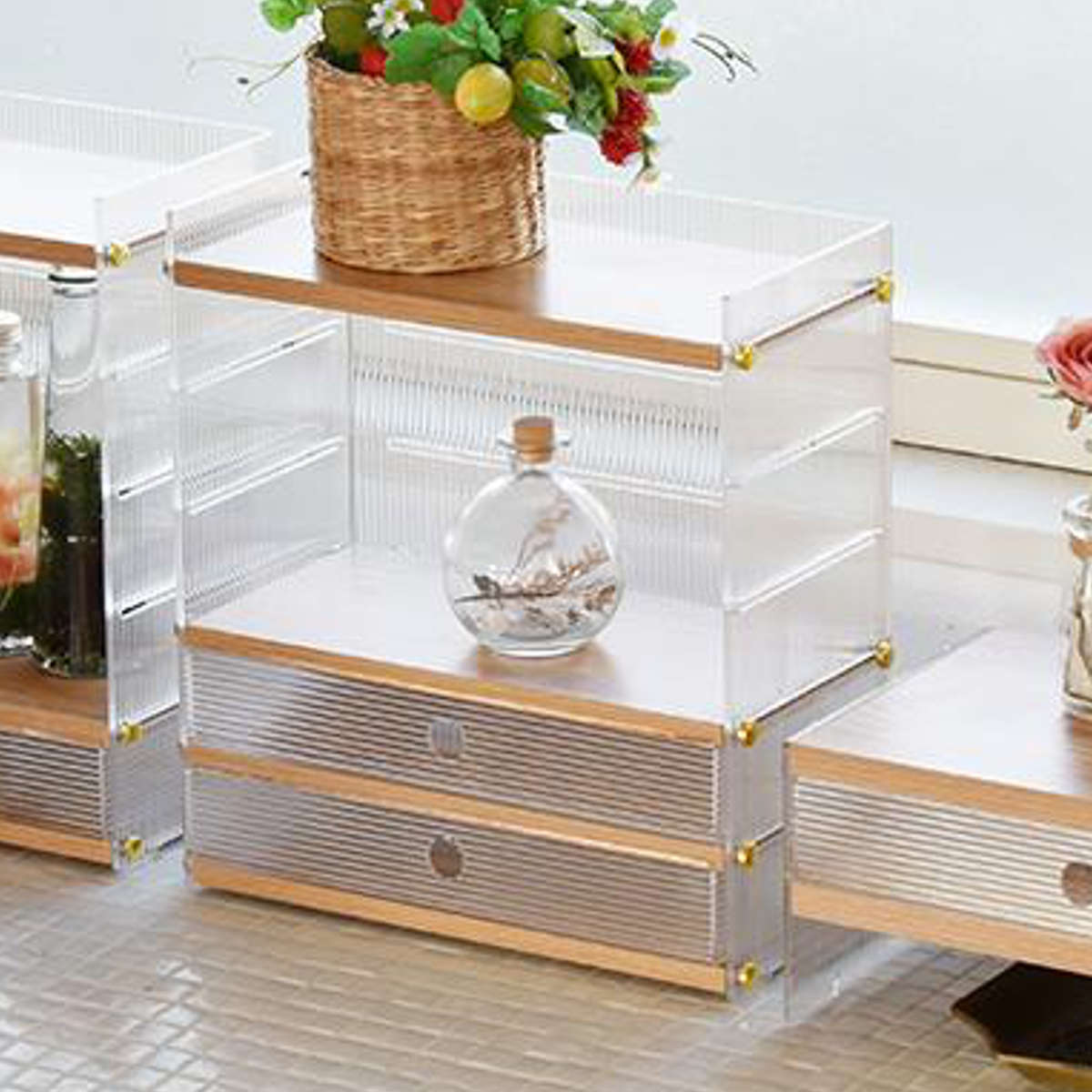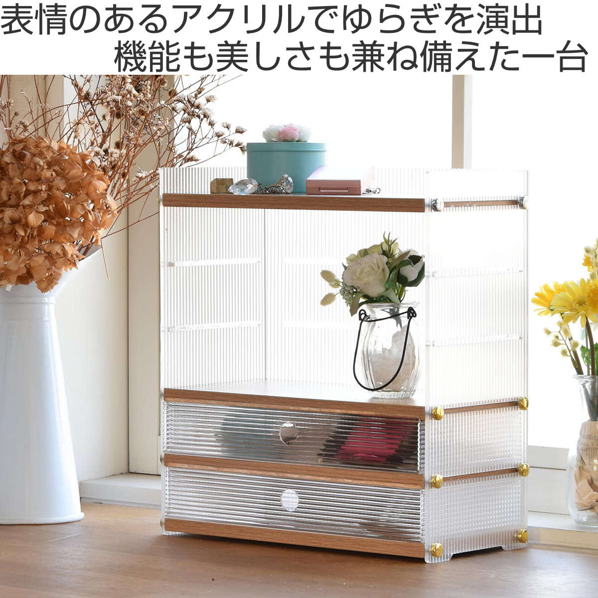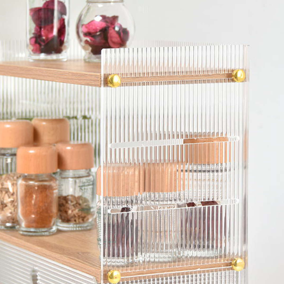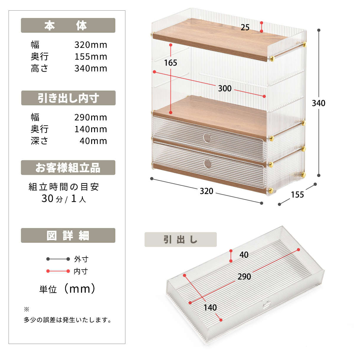 キッチンラック アクリル 引出し 収納棚 2段 ( キッチン収納 スパイスラック 調味料ラック 収納ラック カウンター上 シェルフ 木目調 卓上 ボトルラック デスク収納 リビング コスメ ディスプレイ リブ 透け感 丈夫 おしゃれ )