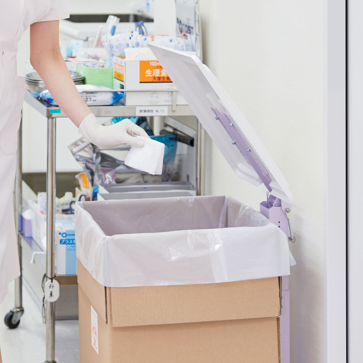 ●多くの医療廃棄用ダンボール容器や内袋に対応し、ホルダー+蓋の組み合わせで、安全かつ衛生的に廃棄物管理が可能です。