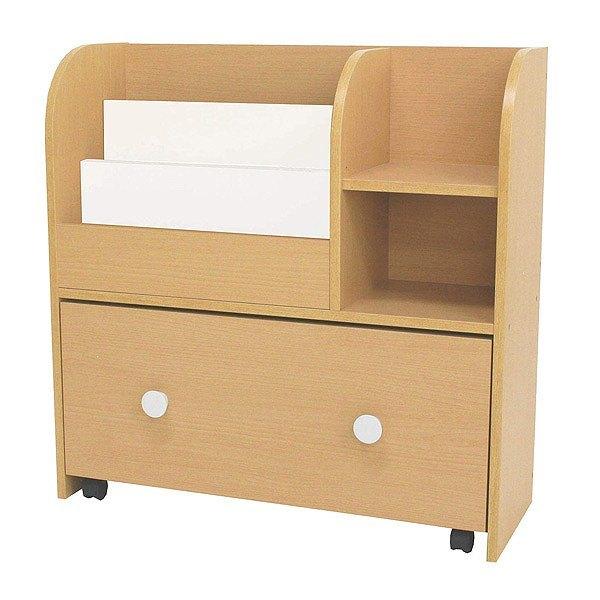 上部には絵本を収納できるラックと小さなおもちゃを飾れます。また、下部にはお子様にも引き出せるキャスター付きのおもちゃ箱が付いていて、大きなおもちゃやぬいぐるみなどが収納出来ます。