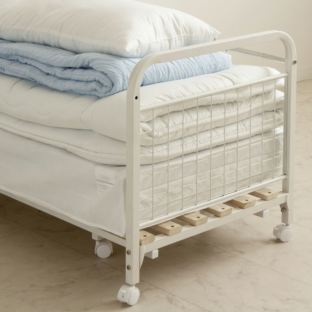 大きな布団もこのキャスター付きのラックに乗せれば、足腰への負担が減りラクに運べます。布団の近くまでラックを移動させ、その場で布団を片付けられます。布団干場や押入れへの移動もしやすく、お掃除も簡単です。