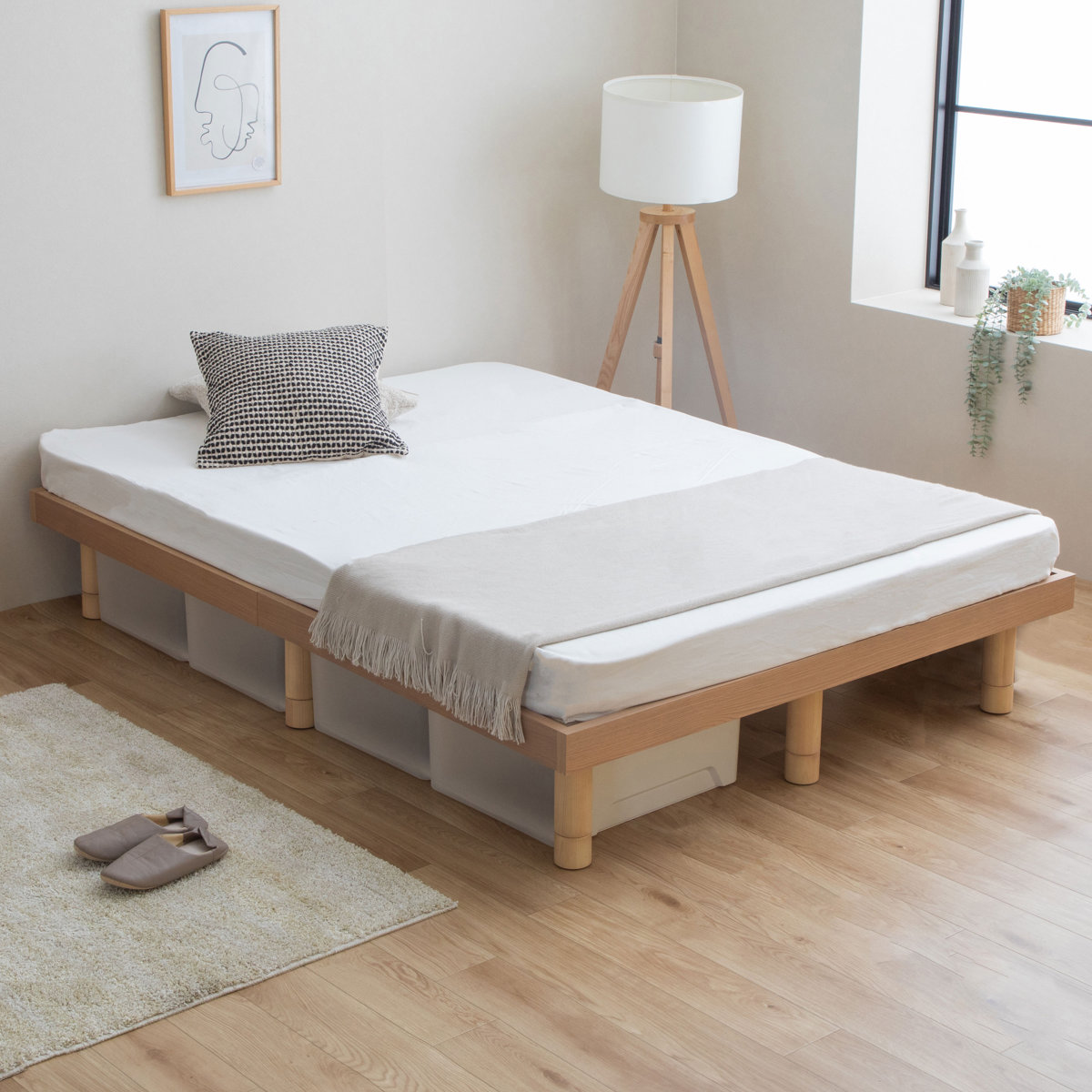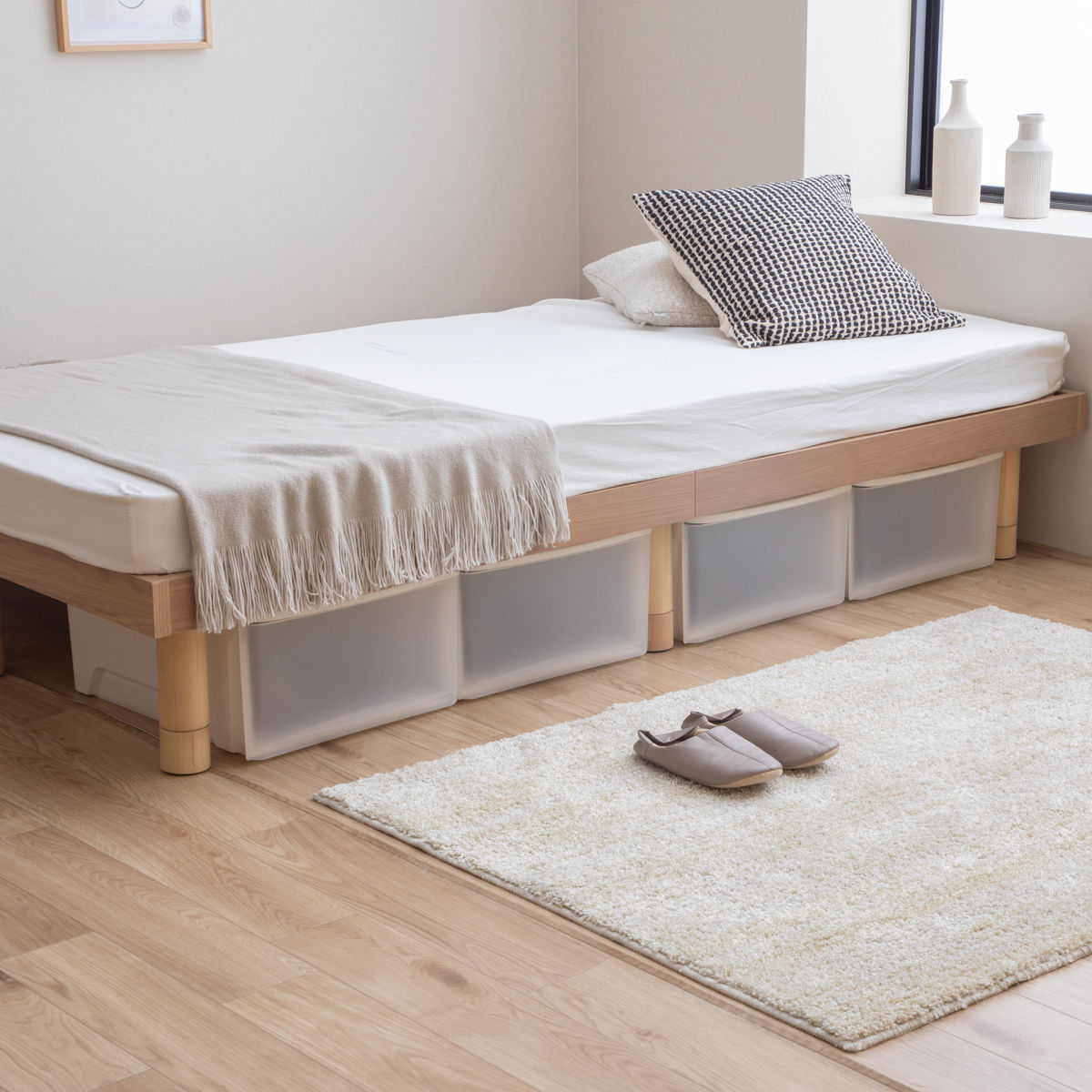 ベッドのマットレスの厚みに合わせたり、布団での使用にちょうどよい高さに設定したりと、自由にカスタマイズできます。さらに、ベッド下のスペースを有効活用できるので、収納したい量に合わせて高さを選べるのも嬉しいポイントです。
