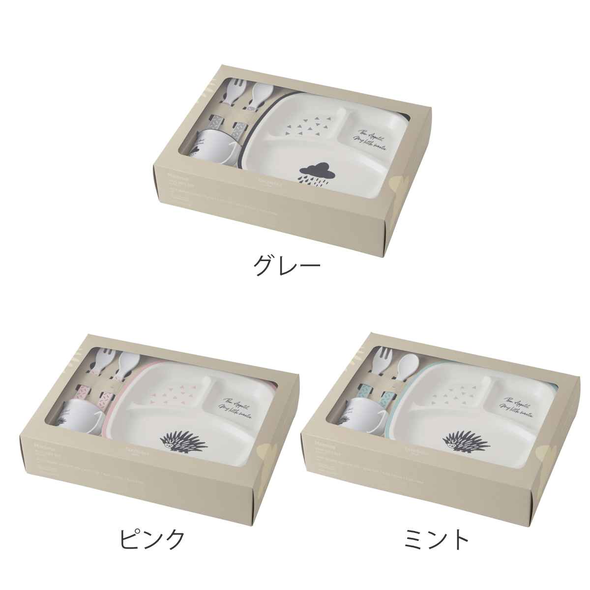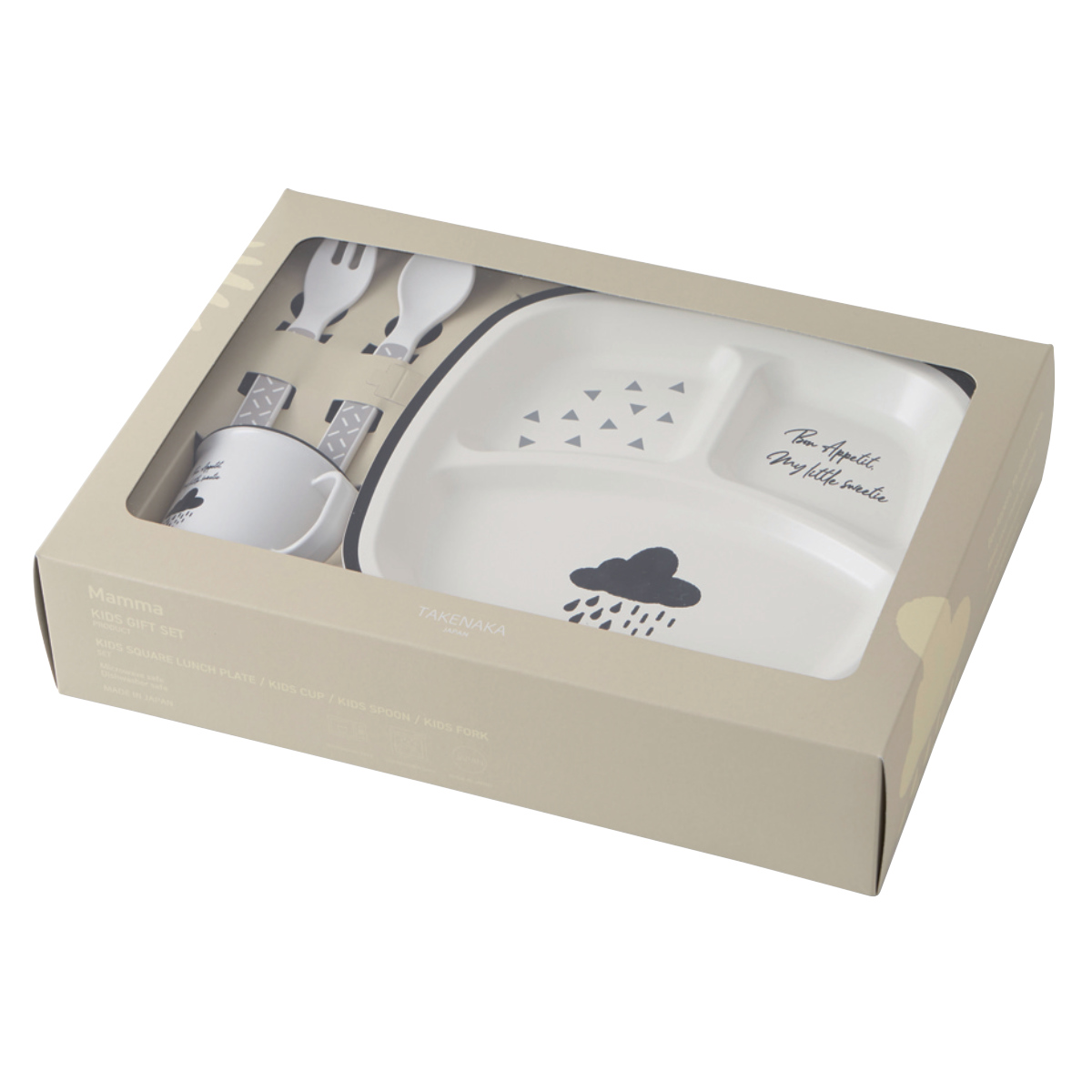 ランチプレート、キッズカップ、スプーン、フォークの4点が入ったギフトセットです。シンプルながらオシャレなデザインで、毎日の食事をちょっと特別にしてくれます。箱入りなのでそのままご家族やご友人へプレゼントできます。