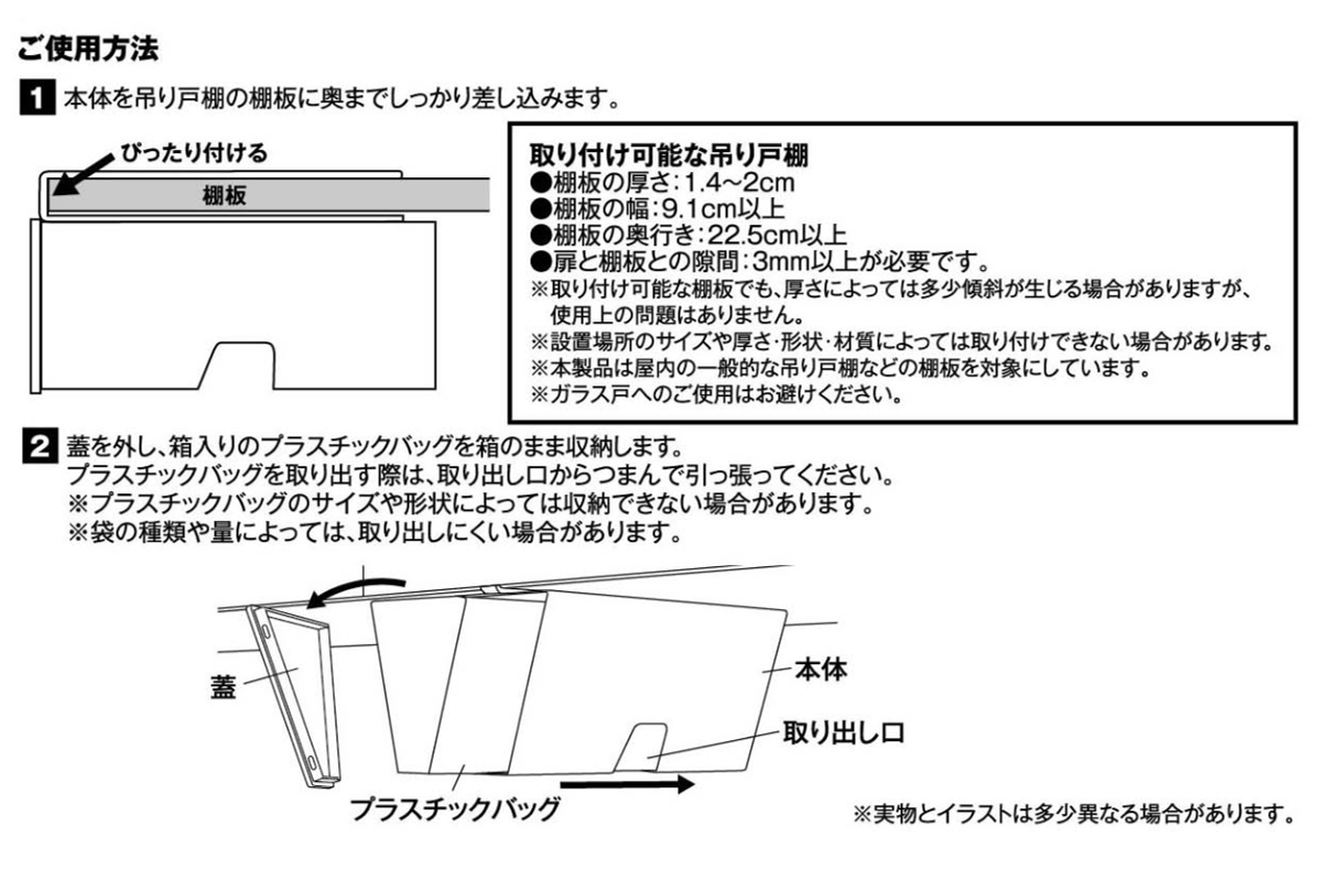 | 対応サイズ | 幅21×奥行8×高さ9.5cmまでの箱入りのプラスチックバッグ ※プラスチックバッグのサイズや形状によって、収納できない場合があります。 |