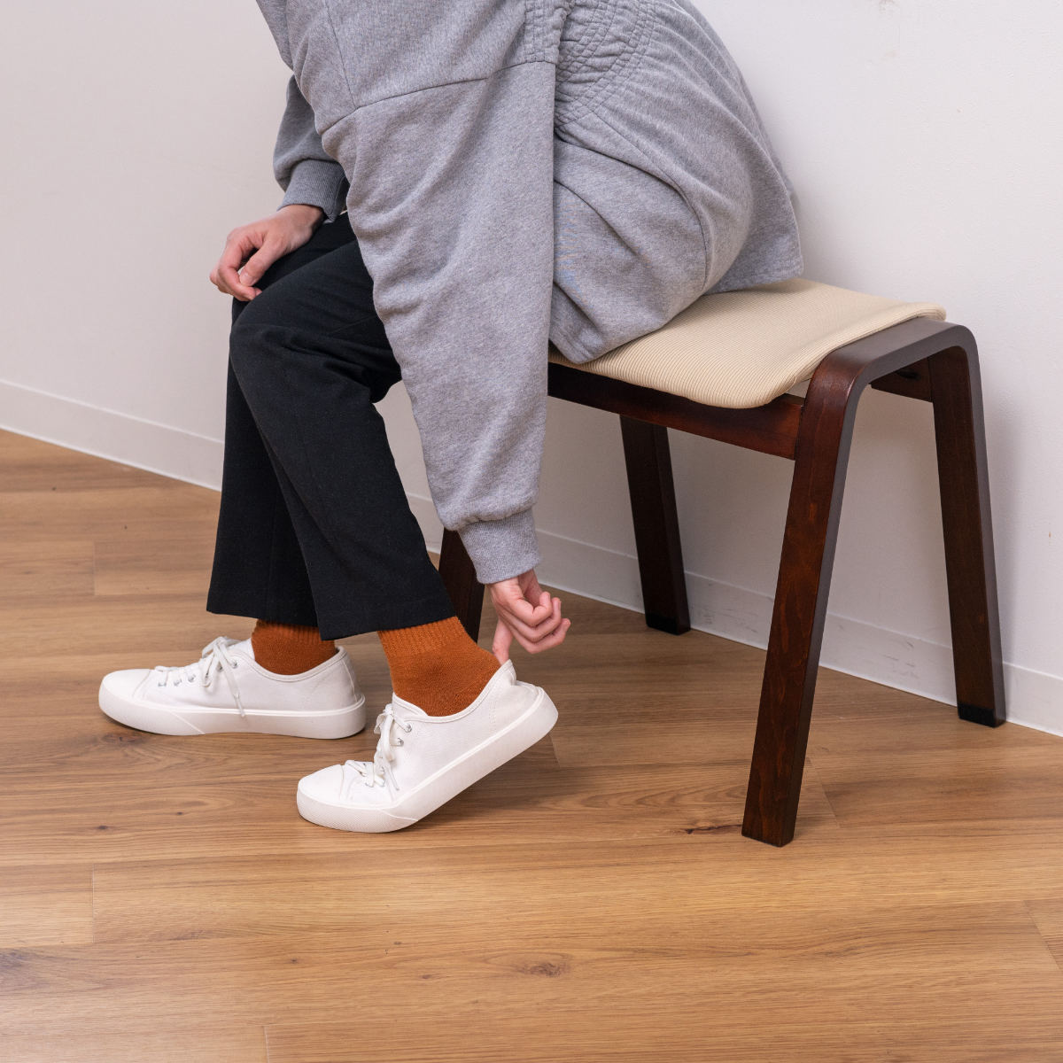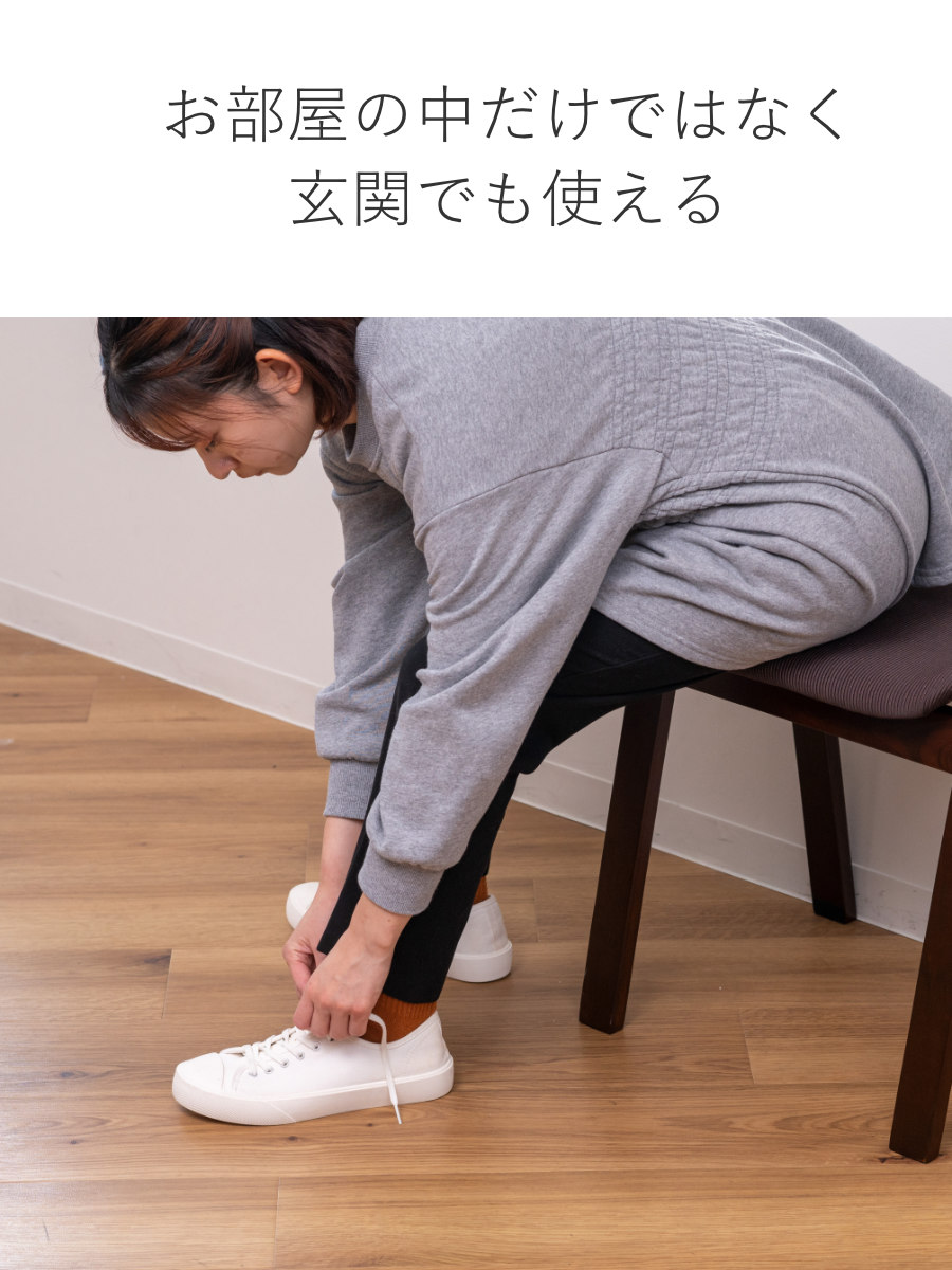 お部屋の中だけではなく玄関でちょっと腰かけられるスツールとしてお使いいただくのもおすすめです。座って靴を脱ぎ履きすれば、足腰に負担をかけずに済みます。
