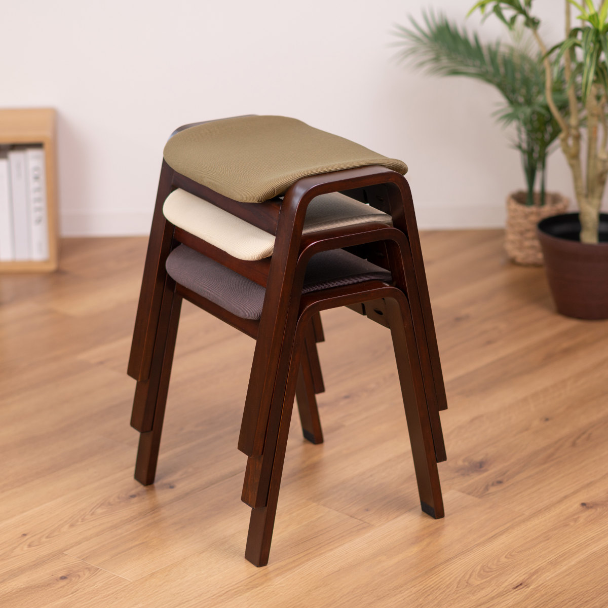 シンプルかつ和モダンなデザインで、洋風のお部屋、和風のお部屋どちらにでも馴染みやすいスツールです。スタッキングが可能なので、使わない時は積み重ねて省スペースに収納することができます。