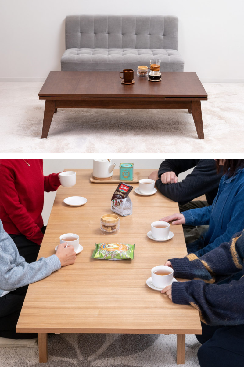 天板の幅は、2人が横に並んでもゆとりができる約150cm、大人数での集まりに最適な約180cmに伸長することができます。急な来客時にもすぐに広げられます。