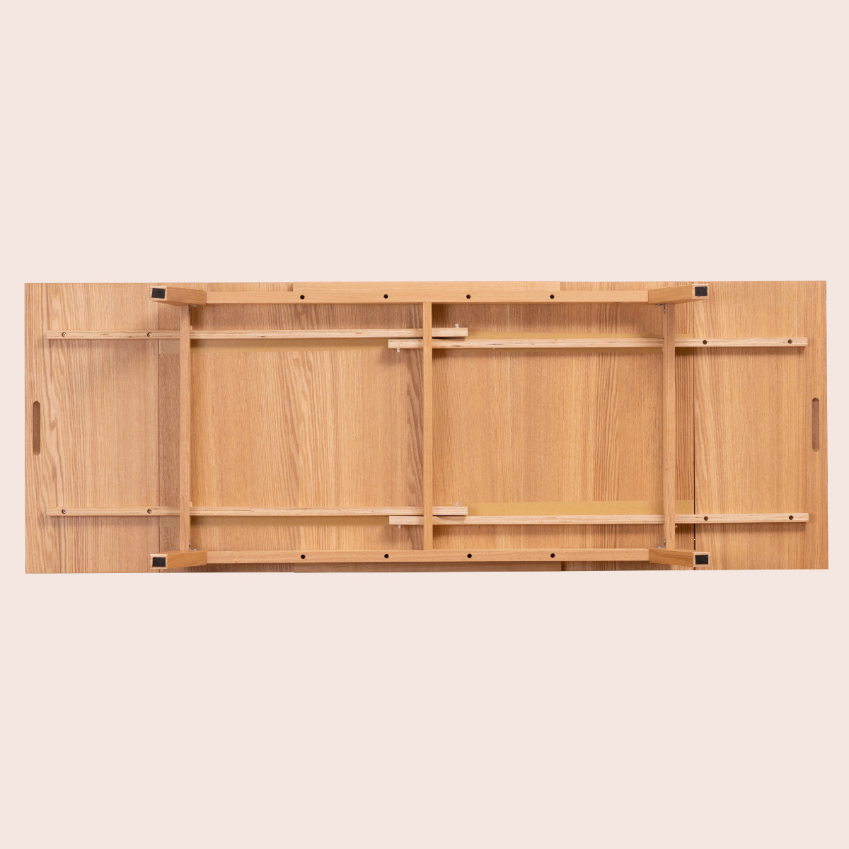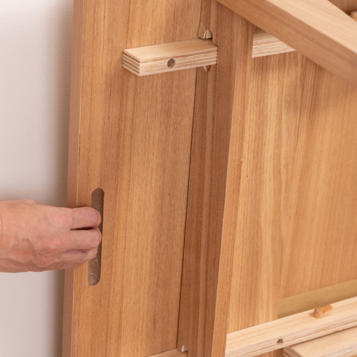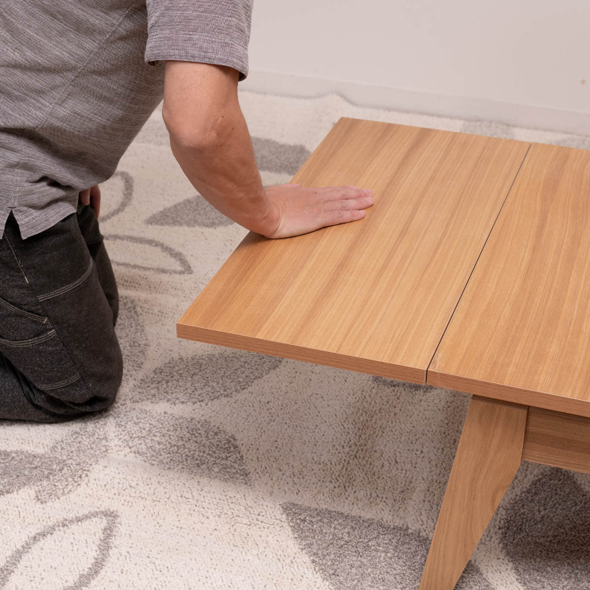 天板を手前にスライドし、上に持ち上げて、押し込むだけなので、女性1人でも伸長できます。スライドしやすいように天板裏にはくぼみが付いています。
