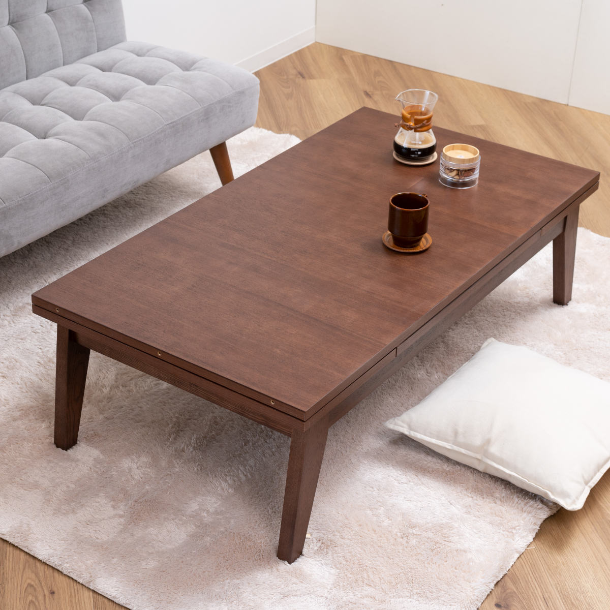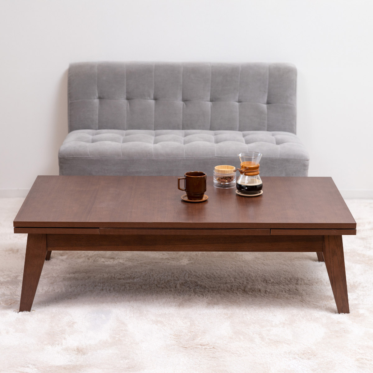 シーンに合わせて天板のサイズを3段階に変更できるテーブルです。生活スタイルに合わせて幅を変えられるので、家族や友人との食事の際など柔軟に対応してくれます。