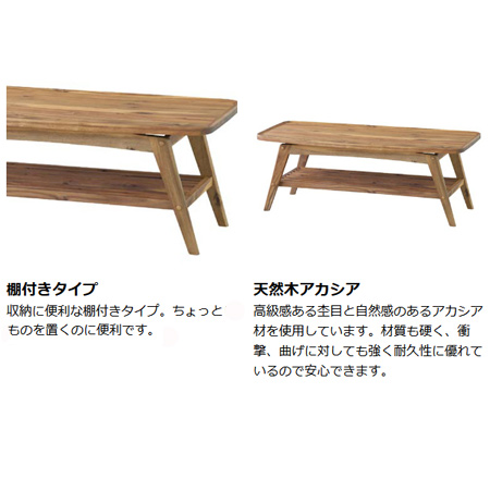 ●天板にアカシアを使用した棚付きコーヒーテーブルです。●棚部分には雑誌などを置いておけば、使いたいときにサッと取り出せ便利です。