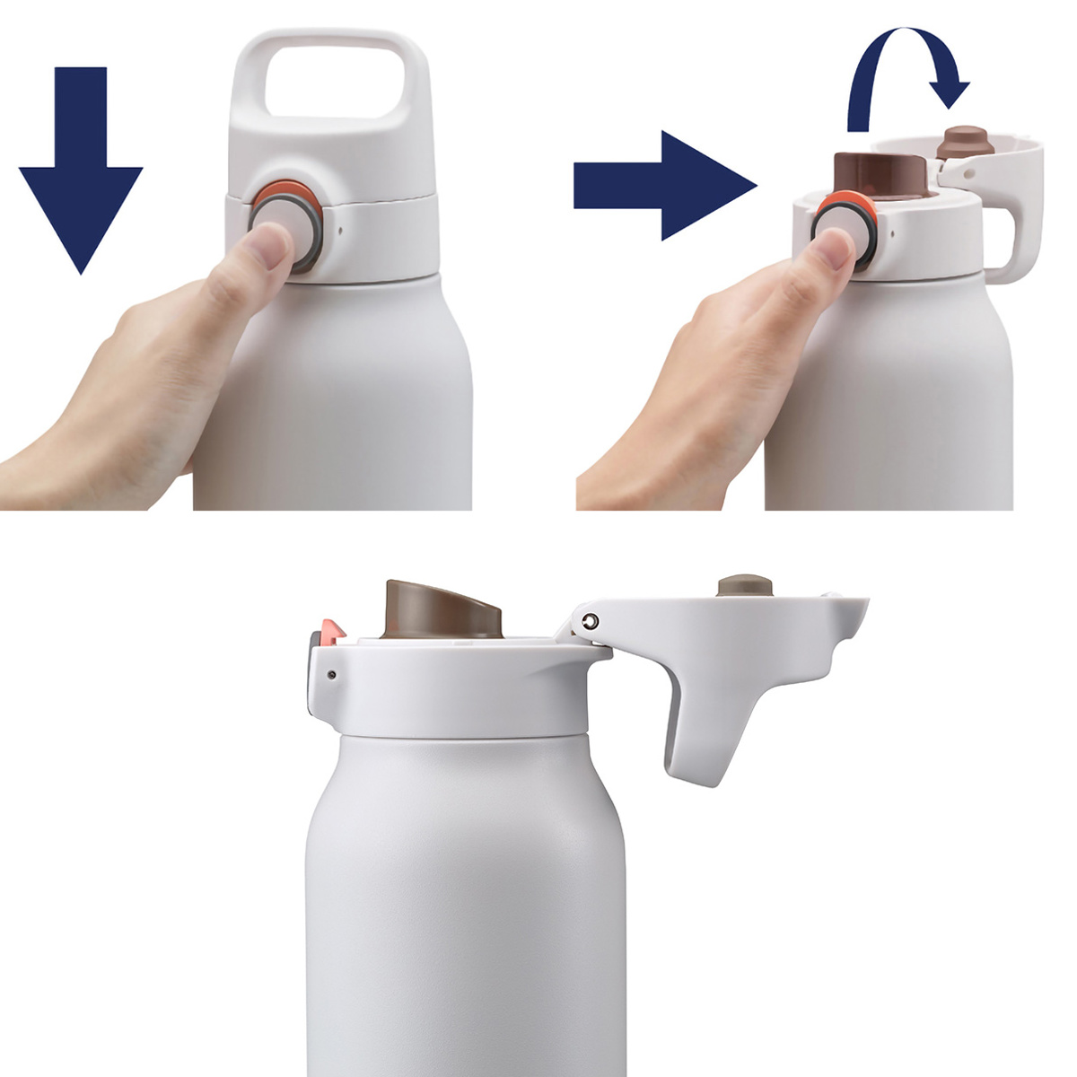 ふたはワンプッシュで簡単に開くため、片手で操作してすばやく水分補給できます。飲み口の形状にもこだわっており、こぼれにくく、飲みやすい設計です。