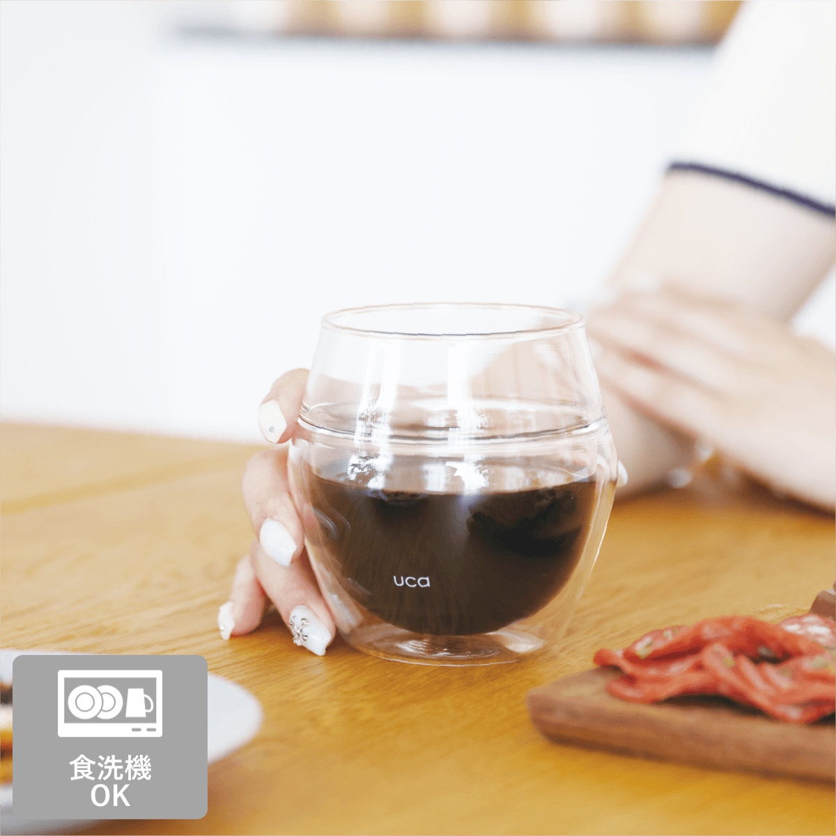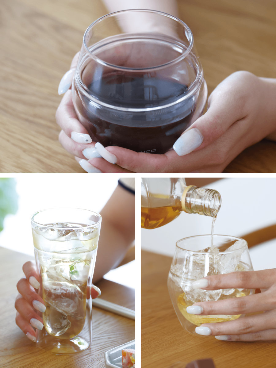 耐熱ガラス製のため、ホットでもアイスでも幅広いドリンクを楽しめます。グラスは二重構造になっており、保冷・保温効果があるため、飲み物の温度をキープしながらゆっくり味わえます。さらに、結露しにくいので、テーブルが水滴で濡れる心配もありません。