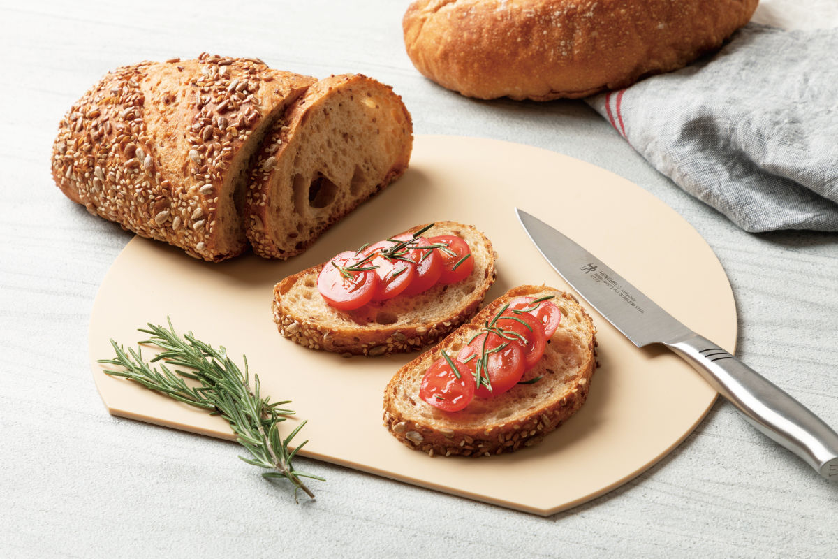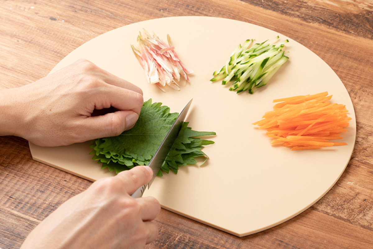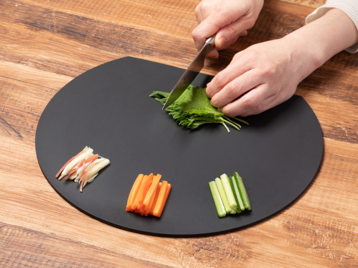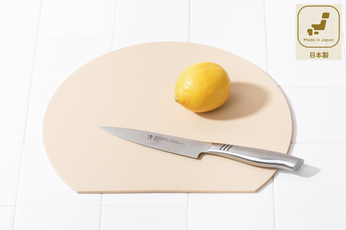 奥行きがあって広く使える丸型と、手前でスムーズに食材が切れる角型の良い所を採用。切った食材をまな板の上に置いたまま他の食材をカットできるので、洗い物が少なく済むのも嬉しいポイントです。