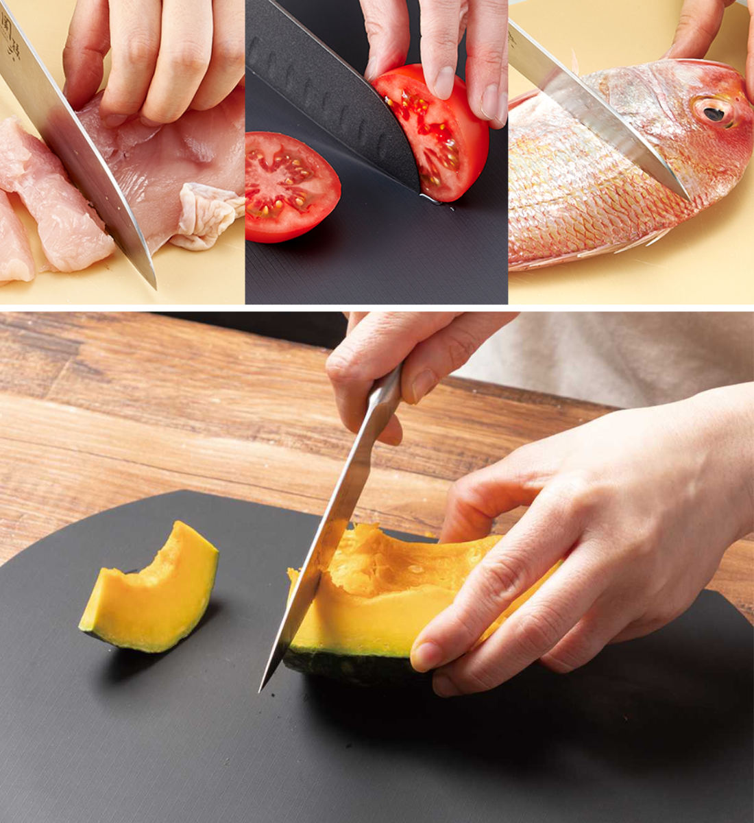 しなやかな弾力性と丈夫さが特長のエラストマー製です。木製のまな板のような柔らかな刃あたりで、食材が滑りにくく刃がしっかりと入り込みます。お肉やお魚、カボチャ等の硬い食材もしっかり楽に切ることができます。