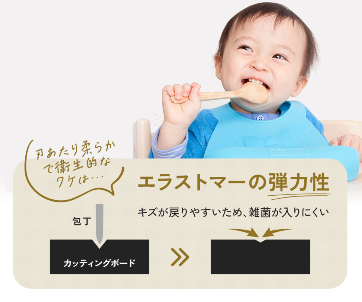 刃あたりが柔らかく衛生的に使える理由は、エラストマーならではの弾力性にあります。包丁跡が戻りやすく、雑菌が入りにくいのが特長です。さらに抗菌加工を施しているため、毎日の食事づくりも安心。水切れがよくニオイも付きにくいので、清潔にお使いいただけます。