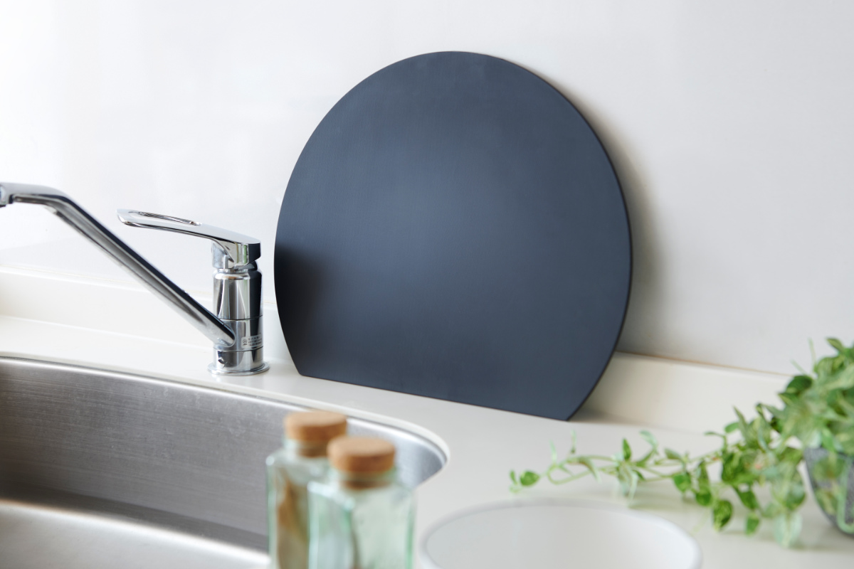 直線の面があるので壁に立て掛けて収納できます。厚さ約4mmの薄型設計で、キッチンの限られた作業スペースでも邪魔になりません。