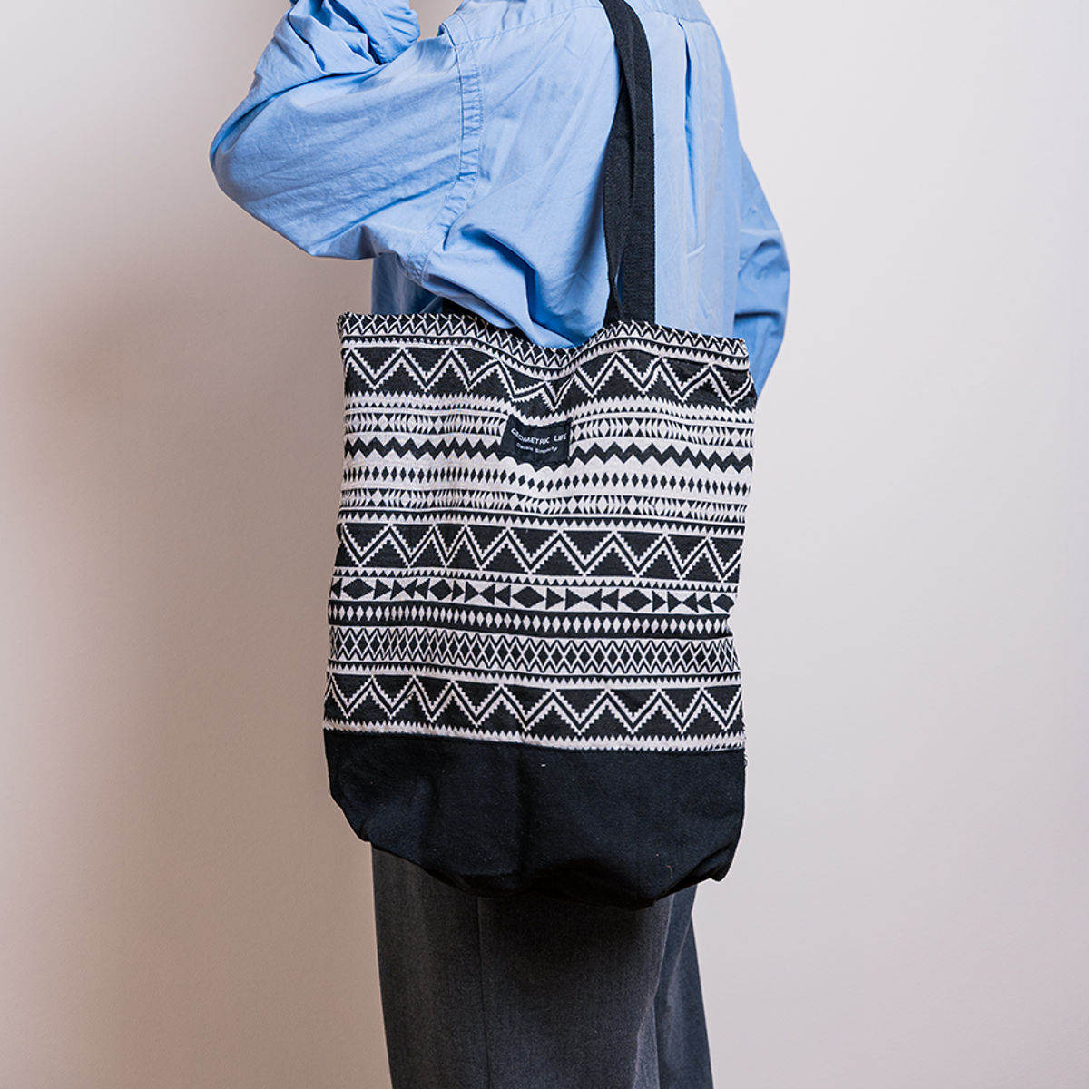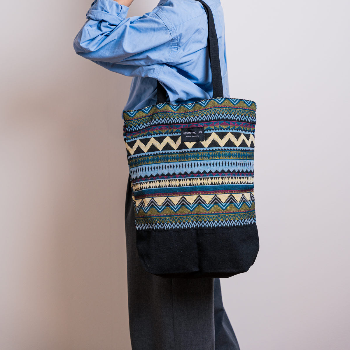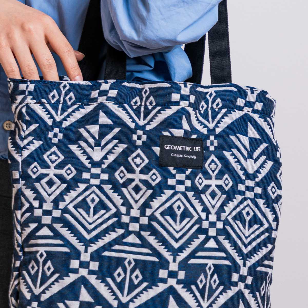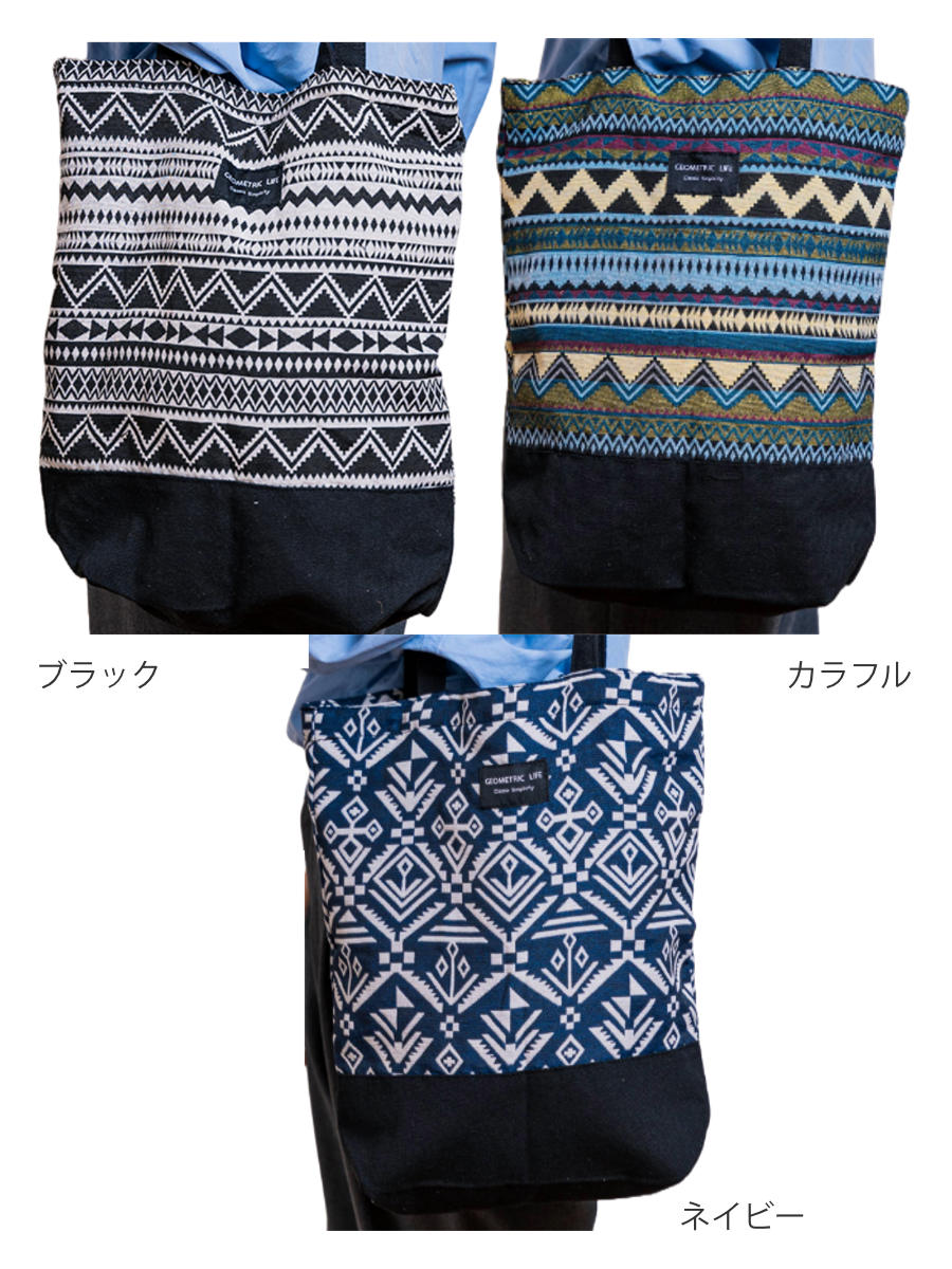 個性的な幾何学模様が目を引くトートバッグです。持つだけでコーディネートのアクセントになります。