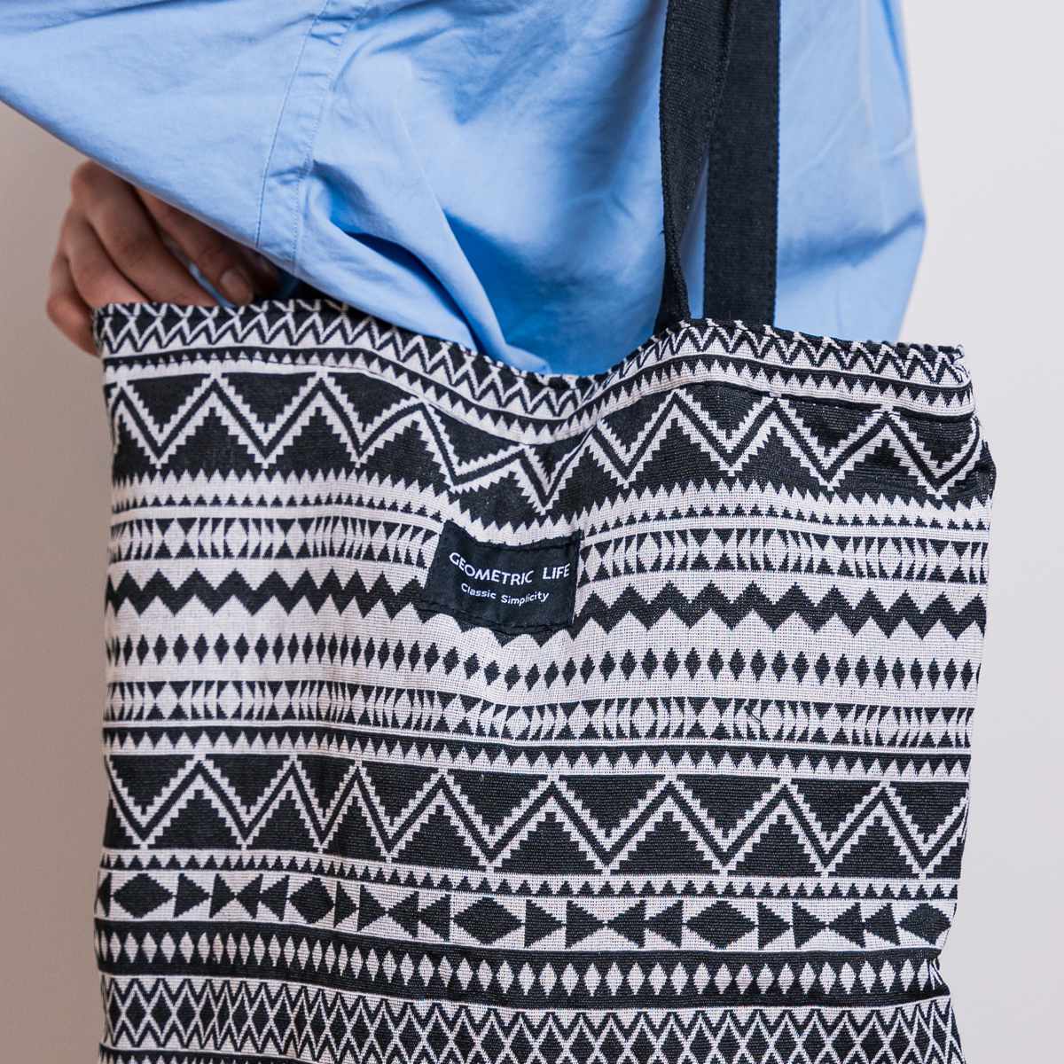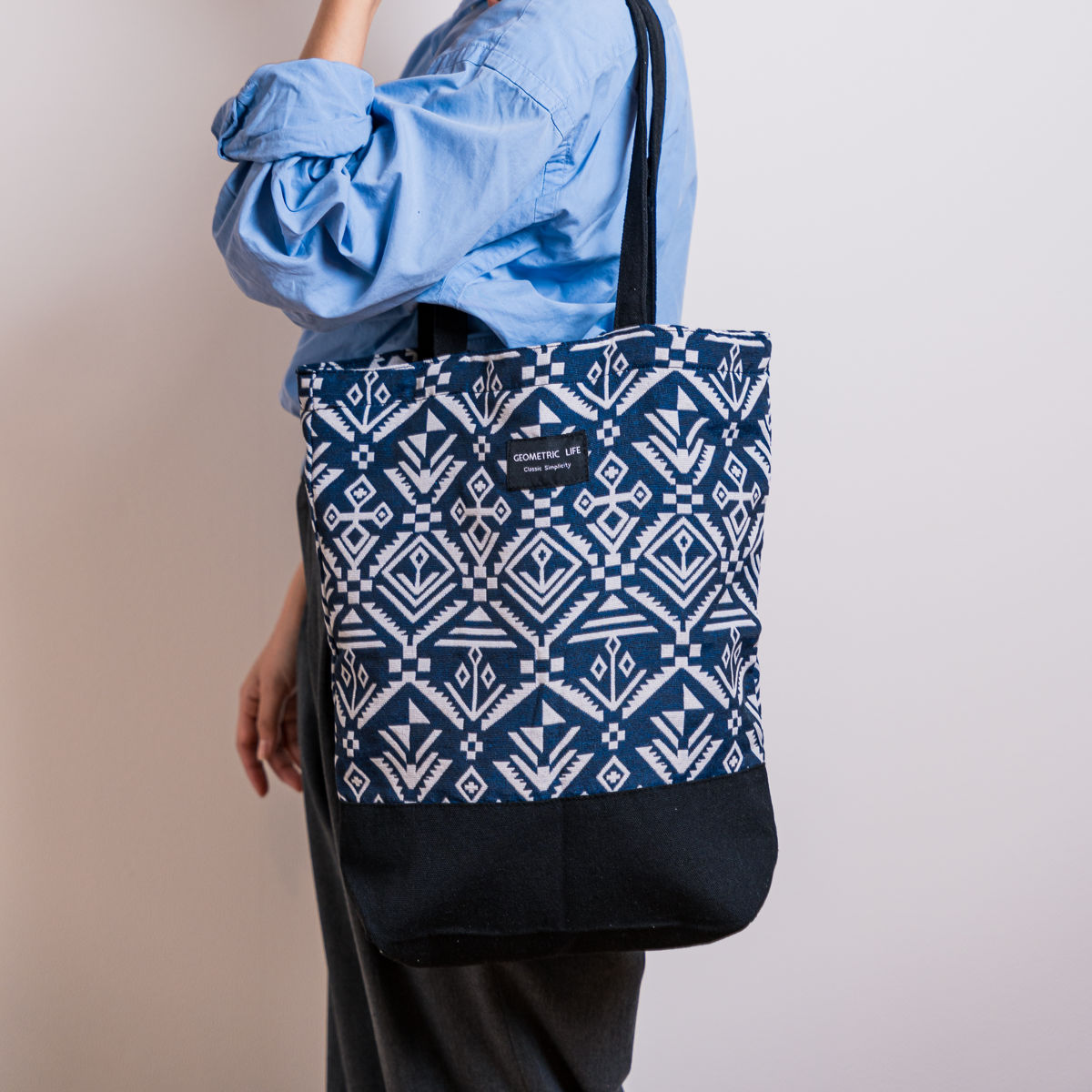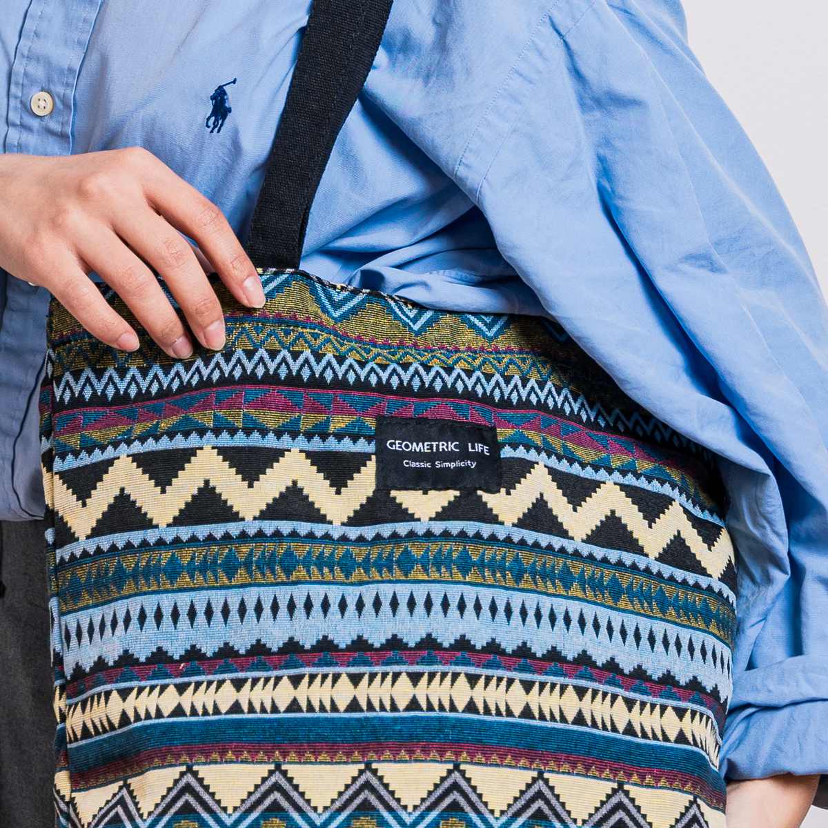 個性的な幾何学模様が目を引くトートバッグです。持つだけでコーディネートのアクセントになります。
