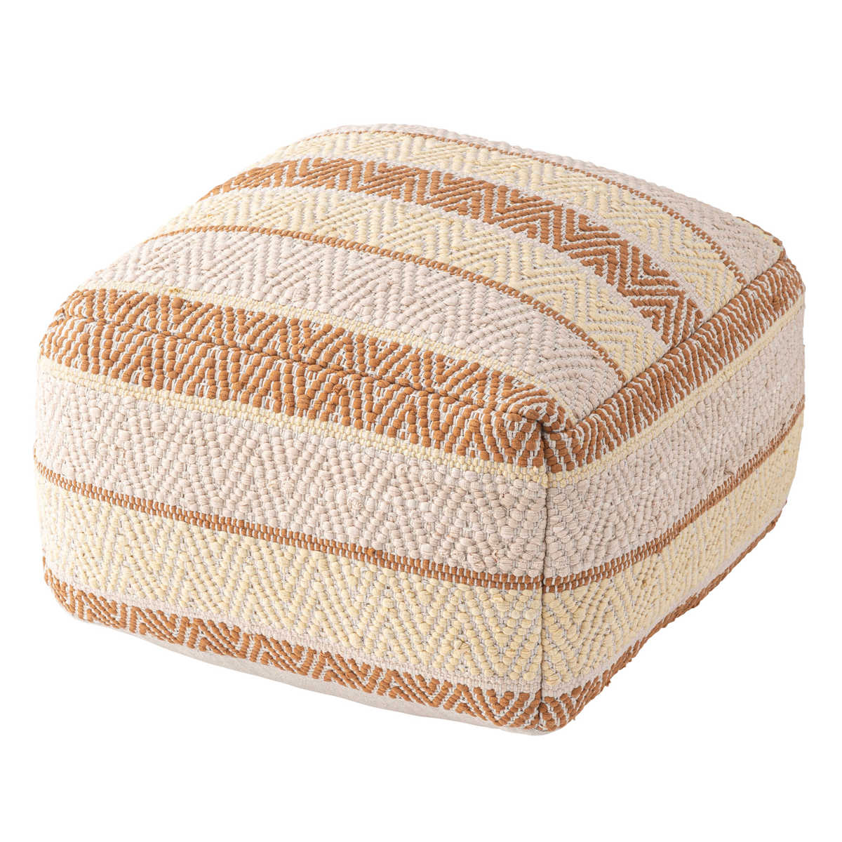 やわらかな手触りのよいコットンのキューブスツールです。ナチュラルな生成りカラーにアクセントの模様を織り込んだ手織りの風合いが魅力です。約54cmのワイドな座面は、落ち着いて過ごしたい場所におすすめです。