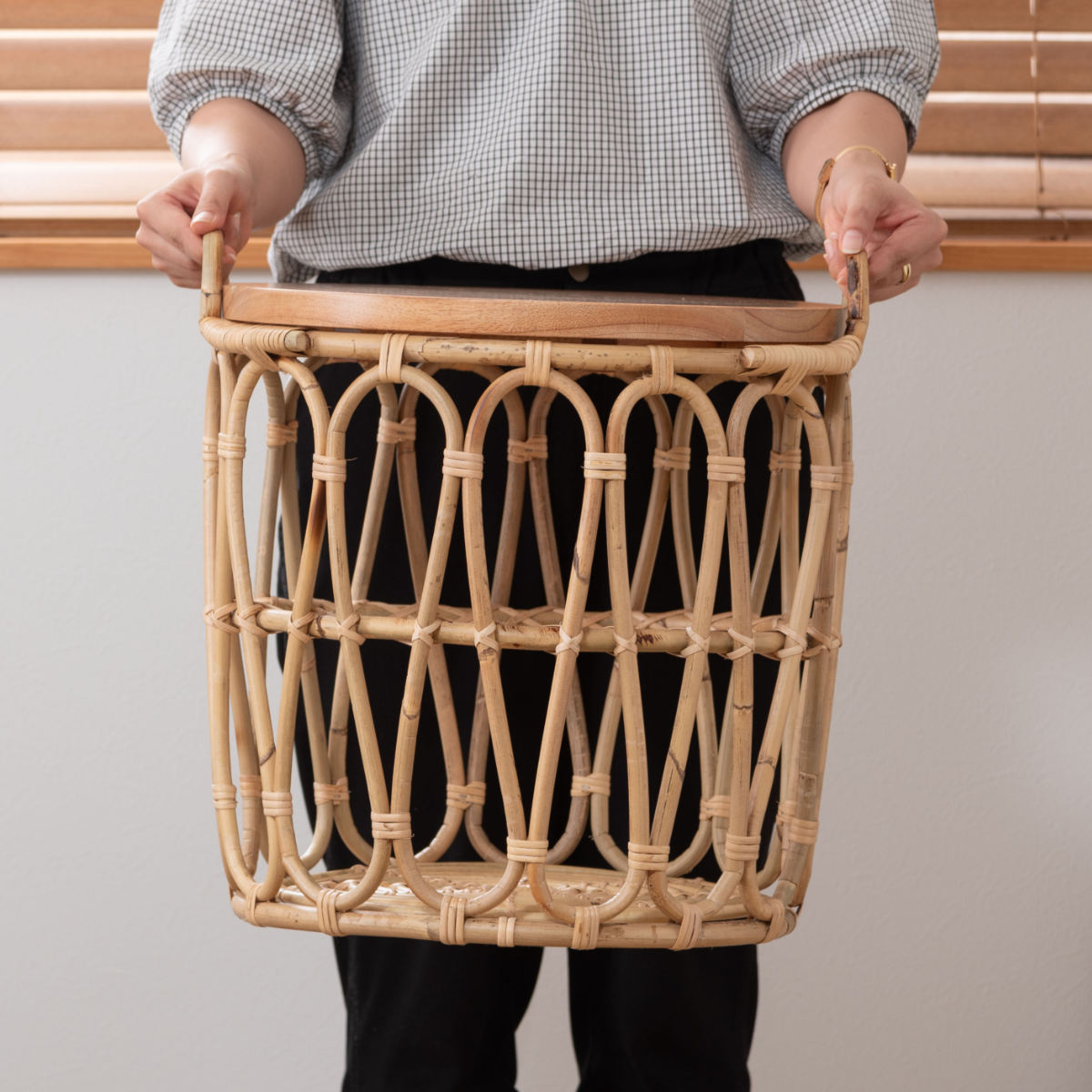 天然木ミンディを使用した丸形の天板は美しい木目が際立ち、空間に温かみを添えてくれます。天板裏には板が2つ取り付けられているので、テーブルとして使用するときは、しっかりバスケットにはめ込むことができます。