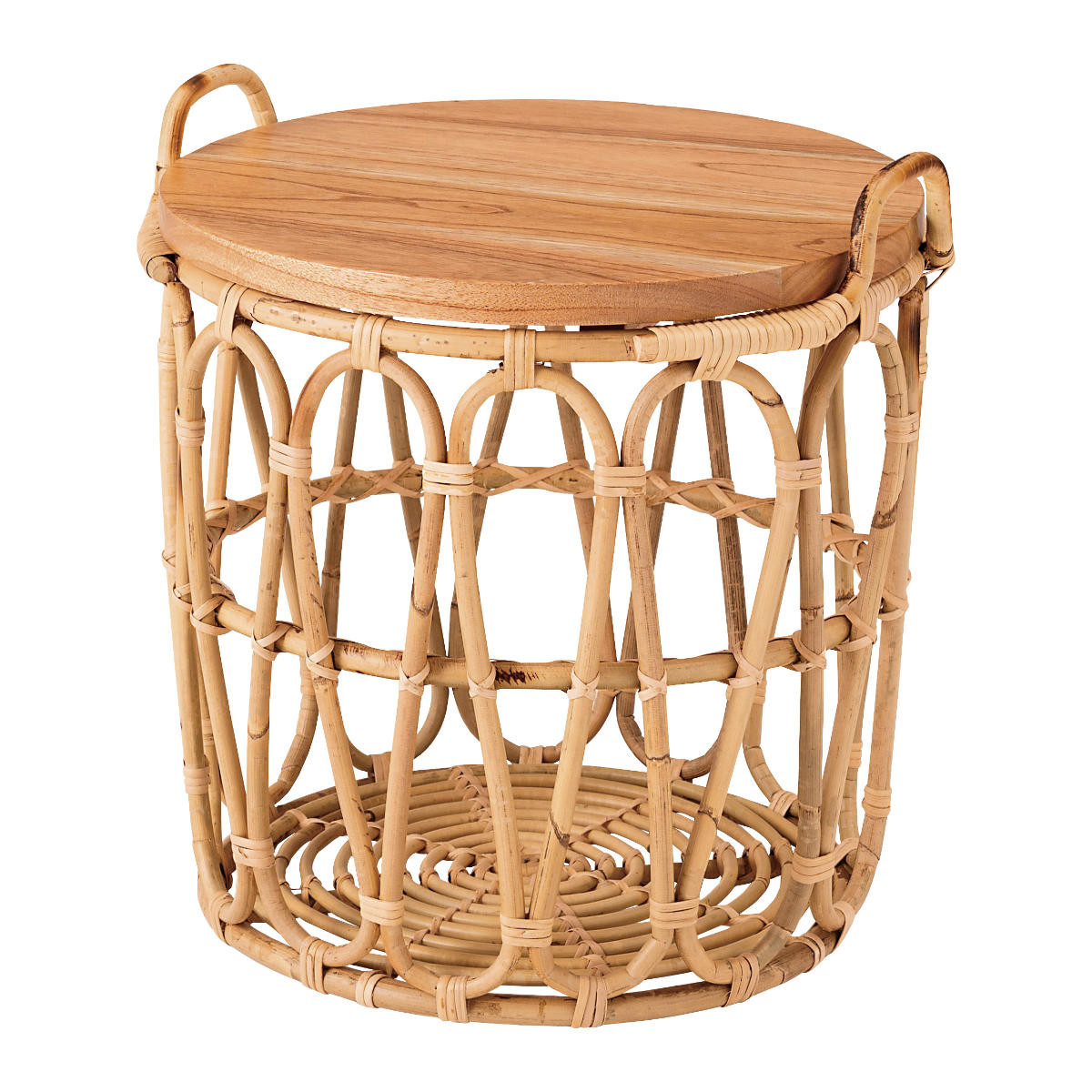 天然木の天板とラタンバスケットを組み合わせた、自然のぬくもりあふれるサイドテーブルです。置くだけで空間に優しい表情を添えるおしゃれなインテリアとして活躍します。