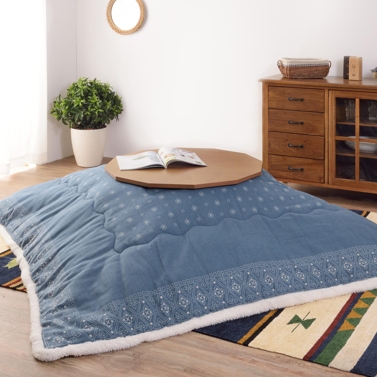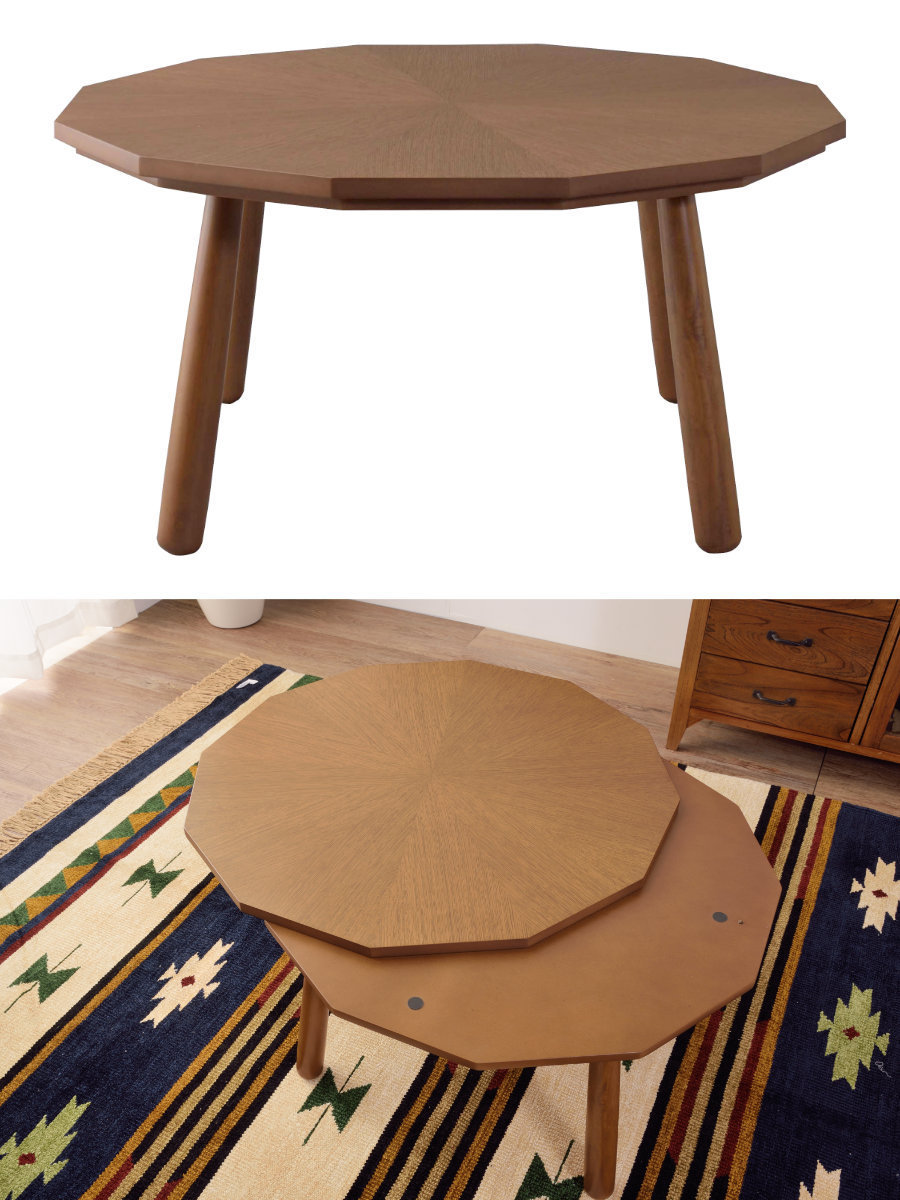 12角形天板の個性的なフォルムが空間のアクセントになり、季節を問わずローテーブルとしても使えるため、1年中すっきりと心地よい暮らしを叶えるこたつテーブルです。