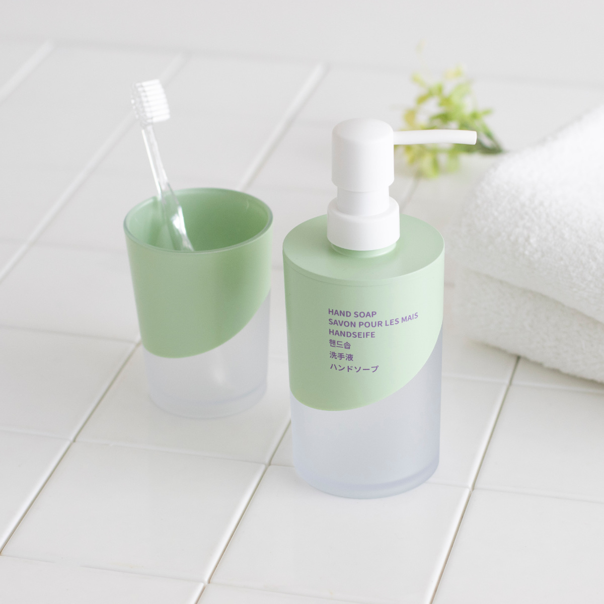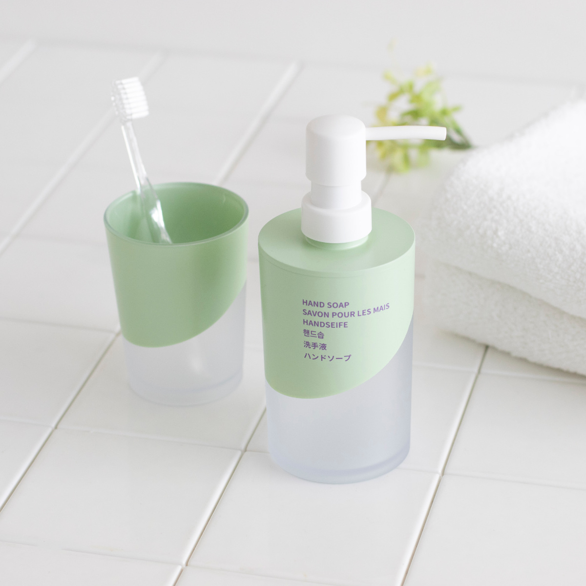 ホワイト・グリーン・オレンジの3色をご用意しました。同シリーズのディスペンサーと揃えて使えば、洗面台に統一感と清潔感を演出できます。シャンプー・コンディショナー・ボディソープも展開しており、水まわりをトータルでコーディネートできます。